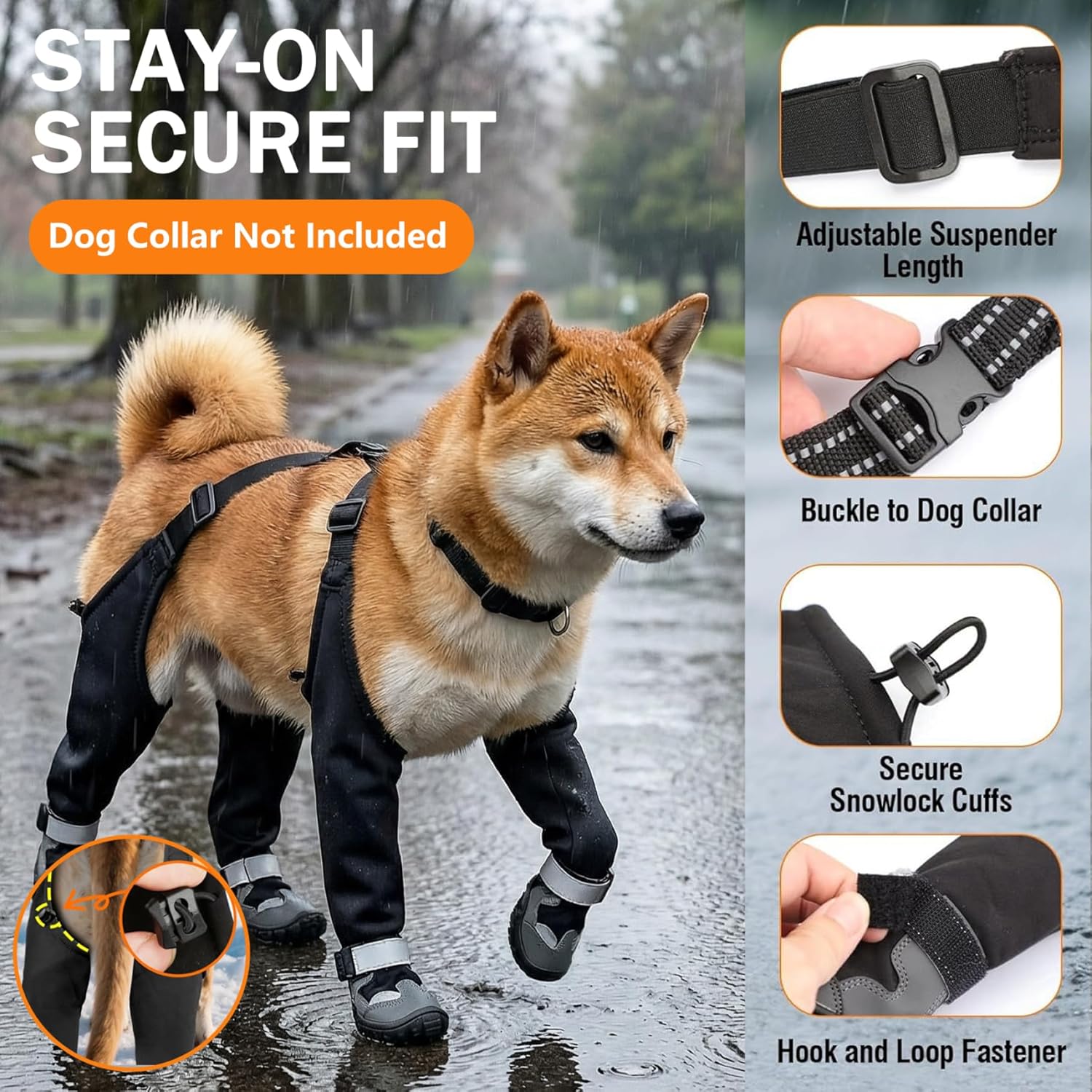 Description: These dog boots with suspenders combine waterproof and dirt-resistant materials with a thoughtfully adjustable design to protect your dog's paws during all types of outdoor adventures. Featuring anti-slip soles, the boots enhance traction on slippery or uneven terrain, reducing the risk of injury. The suspenders and adjustable straps provide a secure, personalized fit, preventing boots from falling off or causing discomfort, suitable for various dog sizes and breeds. Crafted with lightweight, breathable fabrics, these boots ensure comfort without compromising durability, making them perfect for walking, hiking, or rainy days. Whether shielding paws from rain, mud, or rough surfaces, these boots help keep your pet clean and safe, allowing them to enjoy outdoor activities confidently and comfortably all year round. Features:. Dog Boots with Suspenders. -Color: Black. -Material: Rubber. -Size: XL. Note:Manual measurement, please allow slight errors on size.The colors may exist slight difference due to different screens. Package Including 1 x Dog Boots with Suspenders
