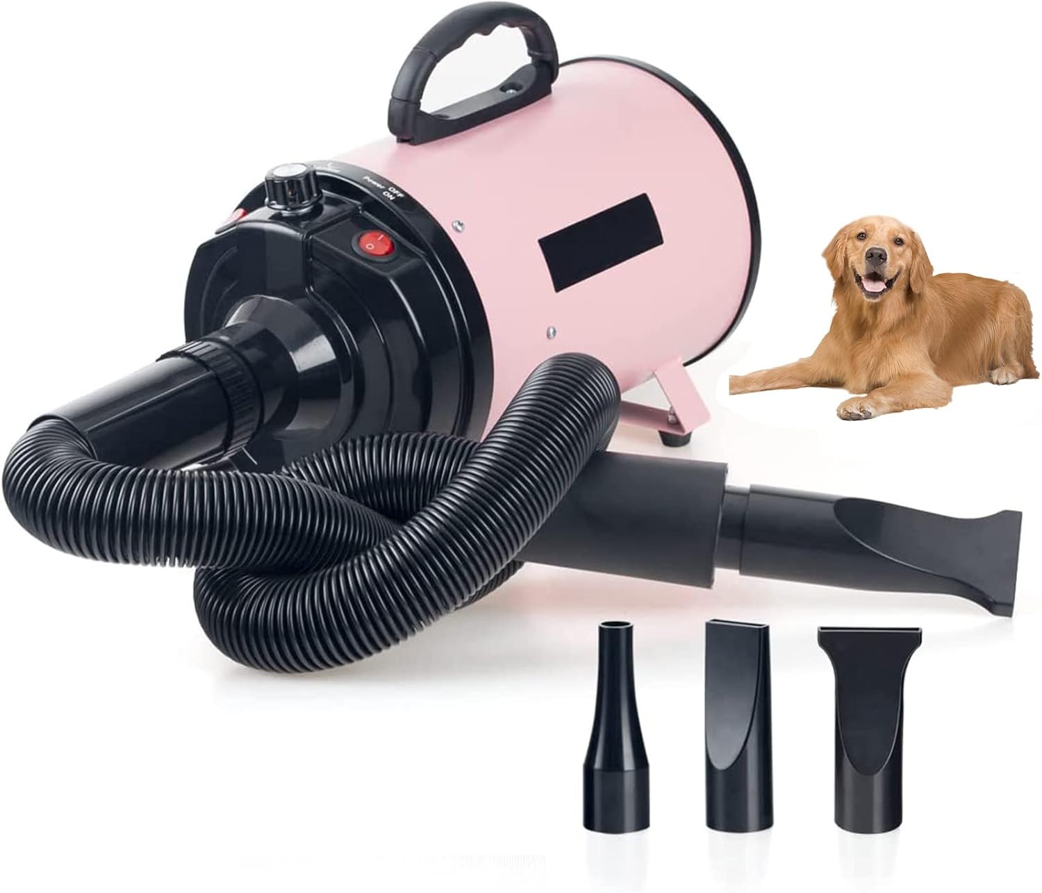 Why choose us?1. With powerful blow force and stable motor, our pet dryer could dry your pets quickly, saving your time and keep your dog from catching cold after shower. 2. 3 kinds of nozzles could diversify the needs of users3. Long hose and power cord which could ensure your movements unrestricted when you dry your pet. 4. Heat insulation can achieve the effect of noise reduction and shock absorption.Parameter:Power: 1200-2800WVoltage: 110V/220VFrequency: 50/60 HzWind speed: 20-72 m/s (Adjustable)Temperature: 95°-131°F (Adjustable) Percussion Force: 700G AroundProduct accessories: mouthpiece*3, hose*1Hose length: 2.5*7.5ft/76-230cmFilter element diameter: 5.1in/13cmPower Cord length: 4.9ft/1.5mProduct Size: 13.6*6.5*9.6in/34.5*16.5*24.5cmProduct net weight: 8.07lb/3.66kgHow to install hose?1. Hose aligns to the air outlet2. Install3. Lock the snap and remain the connection fixed.Tips:1. PLEASE don't blow this thing in your dog's eyes and their ears. 2.This hair dryer is POWERFUL! So please put it on high 3. PLEASE don't get too close to your dog when you have the heat turned on and KEEP IT MOVING or you WILL burn your dog. 4. Test it on yourself after it has warmed up with the heat option on (about 2 mins) and see how long you can keep it close to your skin. 5. Just be sure to check that filter regularly if you use it a lot