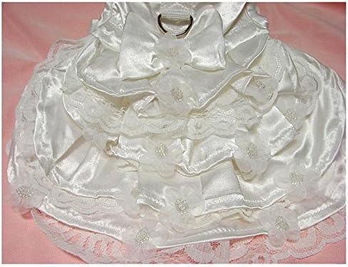 Your little bride will be so beautiful walking down the isle wearing this elegant fully lined, white satin and lace Bridal Gown Set. The gown has three tiers of skirting, each with an under-skirt of delicate white scalloped lace. The body of the dress is made from the highest quality white satin and is adorned with delicate white chiffon flowers, with pearl beads in the center. Each of these adorable little flowers has been hand sewn onto each of the three layers of skirting. This bridal gown set also comes with a matching wedding veil. The veil has a matching white satin head band, also adorned with the chiffon and pearl bead flowers and six layers of high quality Tulle. The six layers of Tulle can be separated to make this beautiful wedding veil very full and elegant (Picture shown with tulle layers separated). This set also includes a matching White Satin Leash. Available in sizes: XXS thru 2XL We have added a strip of Super Strong Nylon down the center, where the D-Ring is attached, for strength and security.