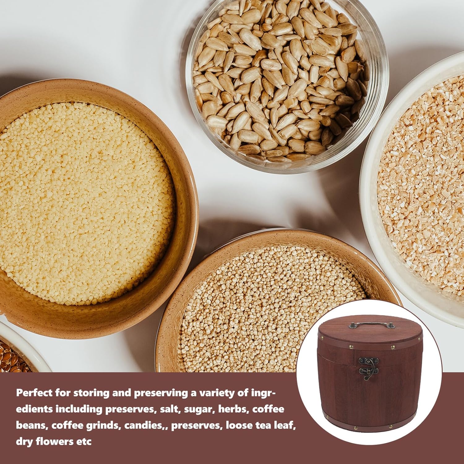Package List 1 x Tea Jar Characteristics -Material:Wood -Size:25.00X25.00X20.00cm/9.82X9.82X7.86in -Color:Light Brown -Product Info:Storage rack - The appearance and design can match your cabinet, highlighting the elegant and modern style tea food can. - Keep ingredients fresh and dry., hermetically sealed round storage tin. to use sealed coffee canister. - Great for serving, decorating, gifting or entertaining with friends and storage container. - This containers good for Jewelry, matcha tea, coffee, sugar, loose leaf tea, flower buds, spices loose tea container. - Small and storage jar. Save space in your kitchen. Also use as home unique decor sugar storage container.Goods Informationsealed coffee canister The cover design has a strong sealing performance to prevent and moisture.kitchen storage jar Not for use at home, but also perfect for cafes, banks, stores, supermarkets and restaurants.wood storage can This will make a great gift for yourself or someone.airtight coffee canister This is a tea jar