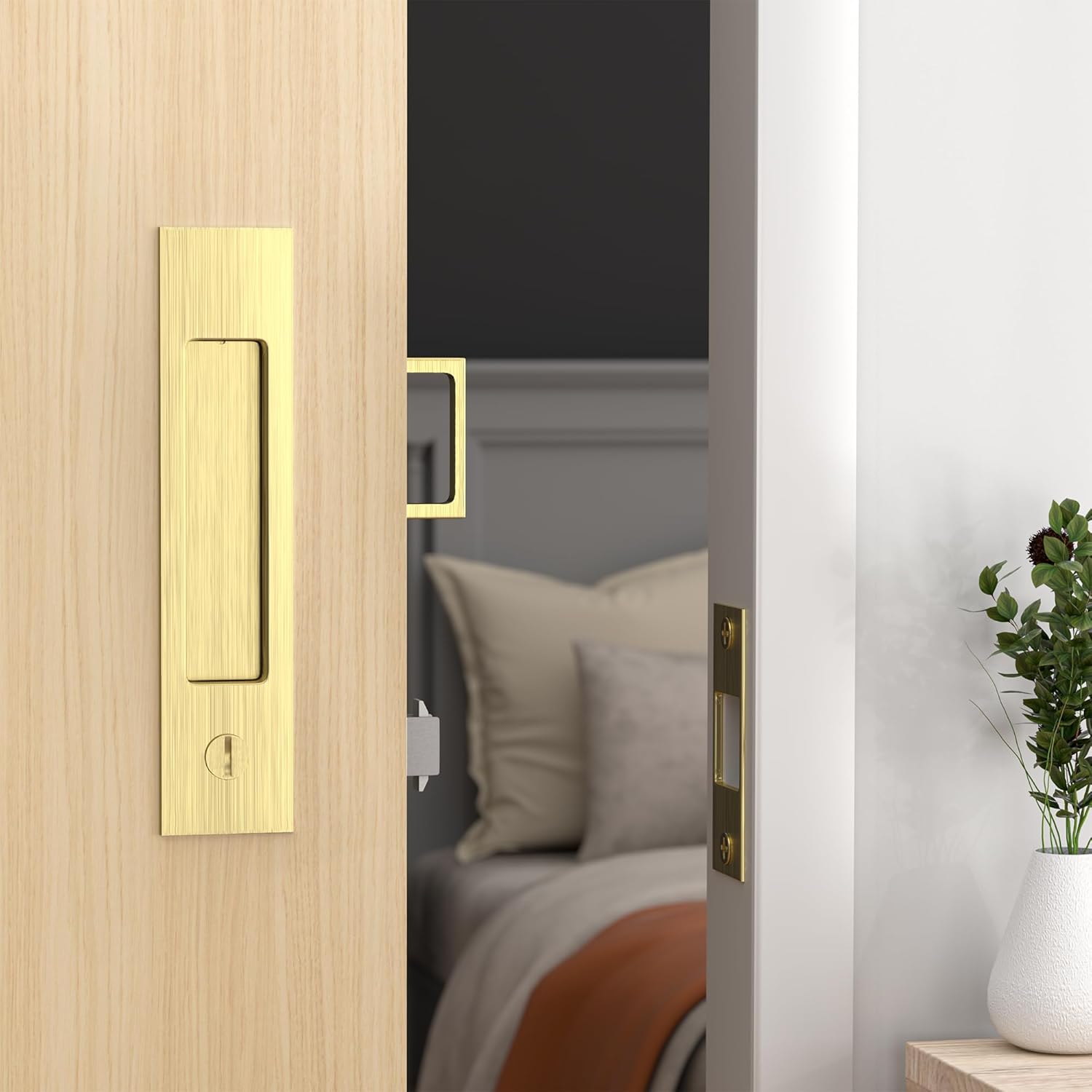 Dontay Pocket Door Handle and Edge Pull, Narrow Modern Rectangular Keyed Entry Function, Recessed Sliding Door Hardware for 1 3/8” to 2 3/16” Thickness Door (Privacy Lock, Satin Brass, 1 Pack)