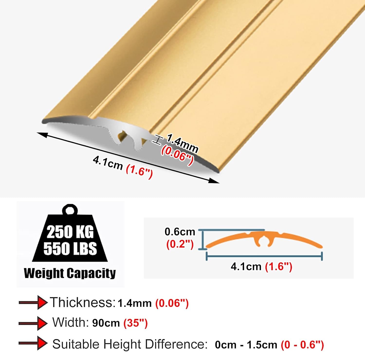 Floor Transition Strip Edge Strip Cover Trim Transition Bar Threshold Divider Strip rampOur carpet floor transition strip can bring convenience for you and your family, at the same time, it can flexibly adapt to the different decoration styles, perfectly into any space!Package Contents: 1 x Threshold Transition StripSpecification:- Material: Aluminum Alloy- Color: Silver, Gold, Black, Gray, Red, Rose gold- Width: 90cm/35inch- Depth: 4.1cm/1.6inch- Thickness: 1.4mm/0.06inch- Suitable Height Difference: 0cm - 1.5cm(0.6").- Load: 250kg/550lbs.- Can be Customized: YesFeature:- Strong aluminum construction can long-term use.- It can create a smooth transition between different flooring surfaces.- Quick & easy installation and can free cut to the length you requireEasy to clean and maintain, It perfect for everyday use.- Carpet trim can cover seam and s carpets or flooring edges.- The Threshold Strip can you trips over or falls.