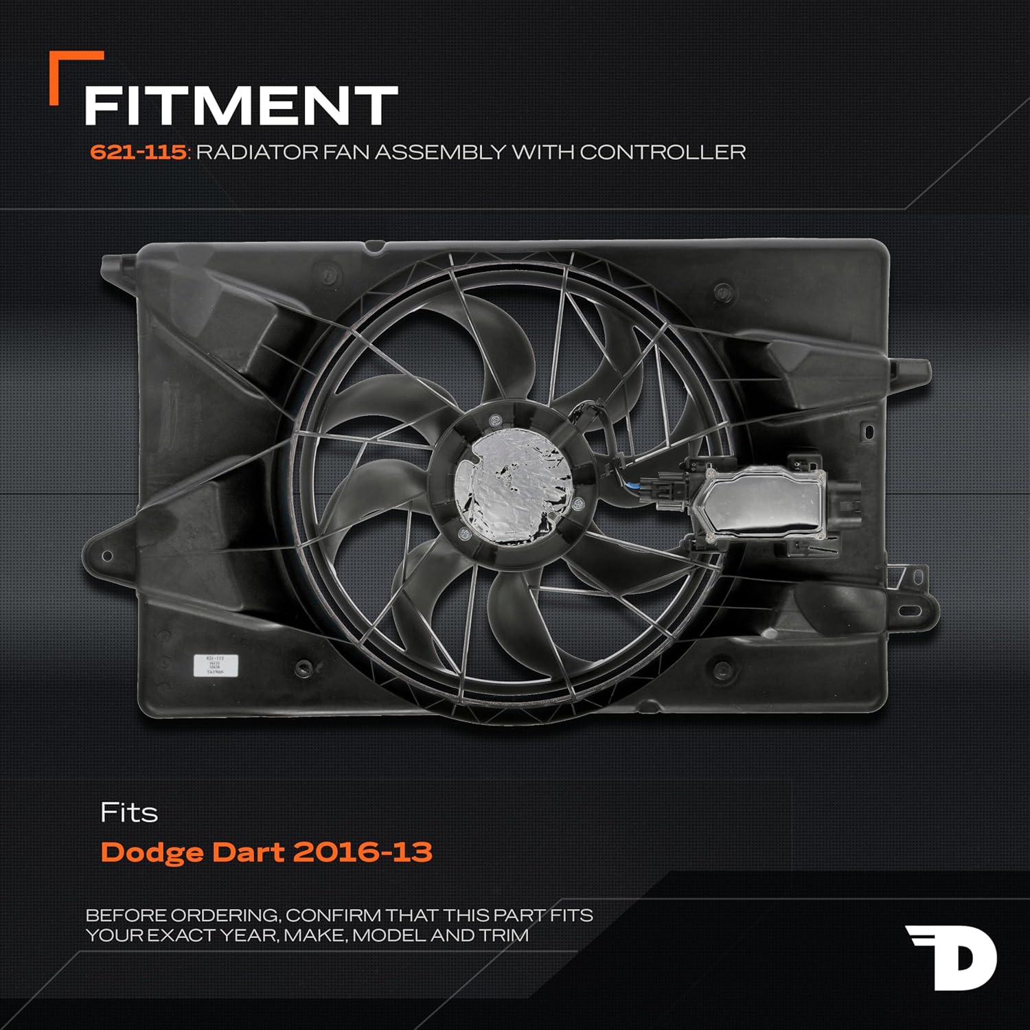 This engine cooling fan assembly is precision-engineered to match the fit and performance of the stock radiator fan on specific vehicle years, makes and models. It has been rigorously tested to ensure it cools as effectively as the original part. This part is compatible with the following vehicles. Before purchasing, enter your vehicle trim in the garage tool to confirm fitment. [Dodge Dart: 2013, 2014, 2015, 2016]