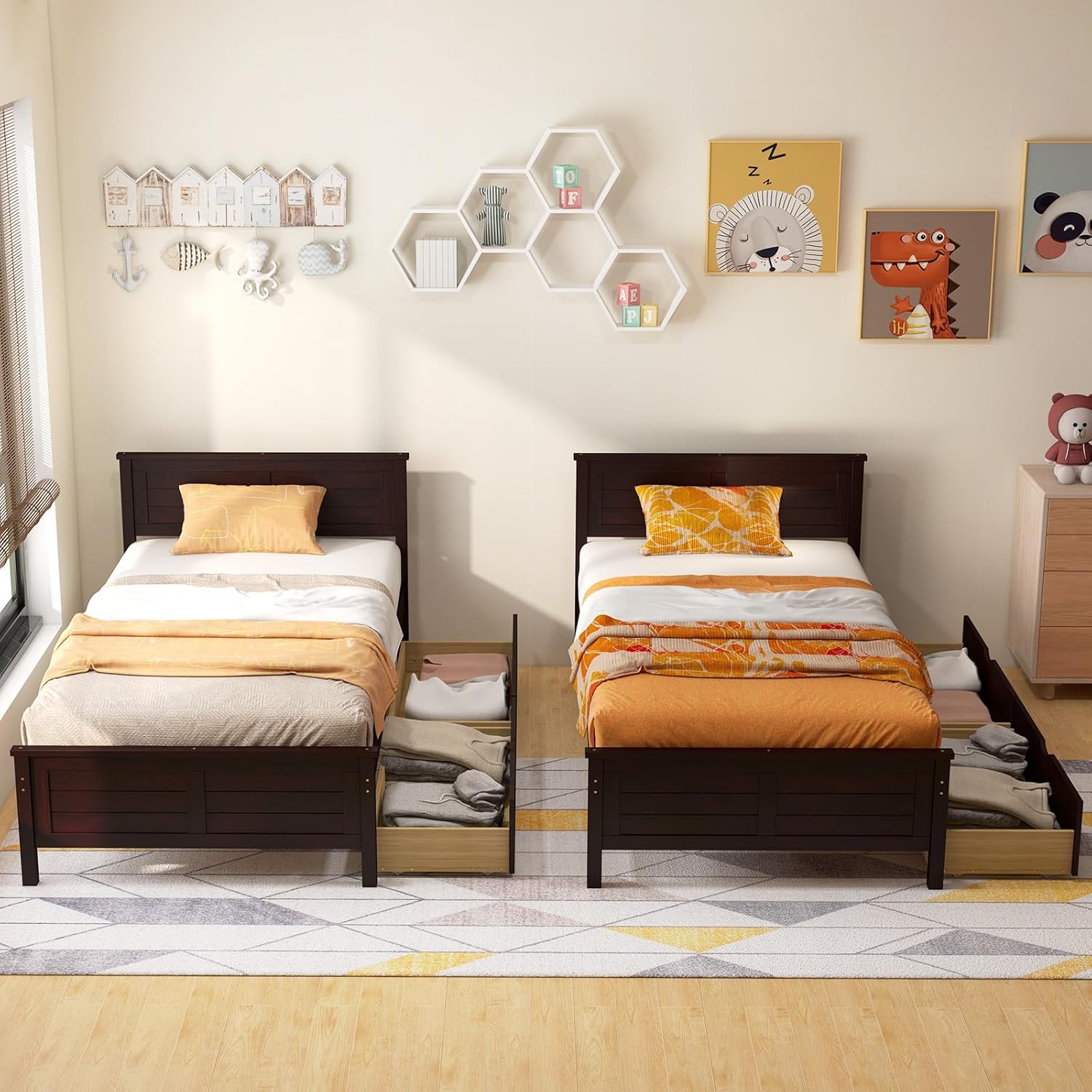 Description: The wood bed frame perfectly meets your daily needs for sleep and storage. Supported by solid wooden slats, the platform bed is sturdy for a long lifespan. Considering convenient storage, 2 drawers with spacious inner space meet daily storage needs, which facilitates the placement of clothes, books, blankets and other sundries. Featuring a solid wood headboard and footboard, the bed frame adds a touch of elegance and sophistication to your bedroom. More, the modern bed frame has an outstanding look, which provides you a comfortable sleeping environment with reliable quality! Features: Sturdy slats are strong enough to support the bed frame Firm bolt connection serves for a long time Solid wood headboard & footboard are elegant and built to last Bed frame with storage drawers for a clutter-free room 2 large slide-out drawers on wheels are available in both sides Cut-out handle for easy opening and closing the drawers Clean lines and modern design add unique charm to your bedroom Specifications: Twin Size Color: Espresso/Gray/White Material: Pine Wood, Plywood, MDF, Engineered Wood Overall Dimension: 80" x 43" x 36.5" (L x W x H) Interior Dimension of Drawer: 35" x 15" x 5" (L x W x H) Recommended Mattress Thickness: 5"-8" Net Weight: 69.5 lbs Weight Capacity: 350 lbs Package includes: 1 x Bed Frame with 2 Drawers 1 x User Guide