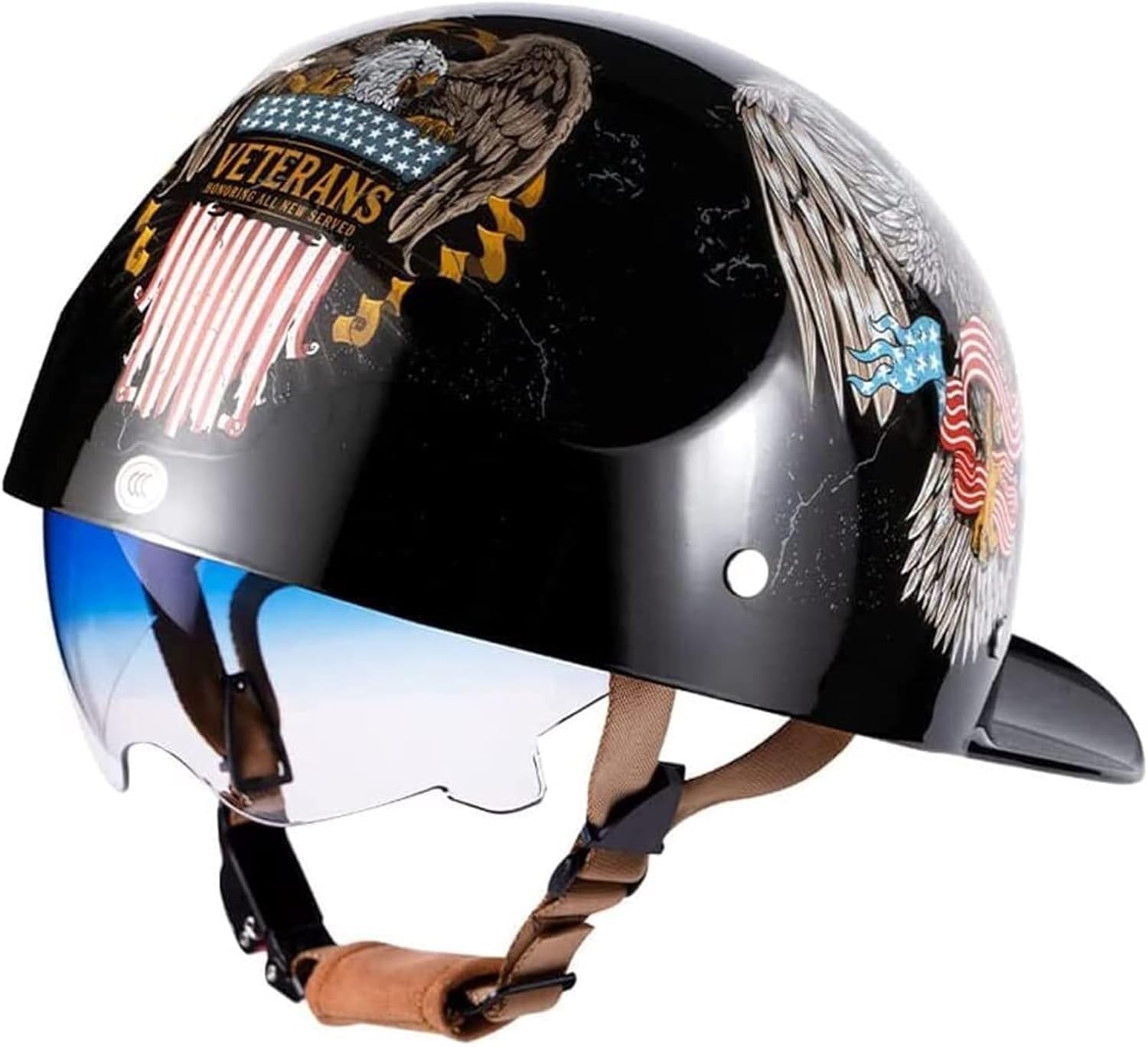 We are a professional manufacturer of motorcycle helmets, and we believe you can find your favorite helmet in our small store. Accompany your cycling journey along the way. To escort you.Helmet information:Half Helmet, Vintage Open Face Baseball Cap Motorcycle HelmeMaterial: high quality ABS material + EPS inner helmetCertification: ECE / DOT safety certificationWeight: about 800gApplicable head circumference:M53-56cm,L57-59cm,XL60-62cm,XXL63-64cmApplicable season: all seasons, especially spring and summerApplicable people: adults, men and women Scope of application: motorcycle / bicycle / locomotive / electric car / scooter // flying / skiing / skating and other safety protectionYou can give it to friends and family, or the best holiday gift for men womenPACKING LIST:1 * helmetNote: For an accurate head measurement, wrap a soft (tailor) measuring tape horizontally around your head about 1'' above your eyebrowsIf your head measurement is between two different sizes on the helmet size chart, if you like the head and helmet close to each other, take the smaller size, if you like it looser, take the larger size The yardage of one point