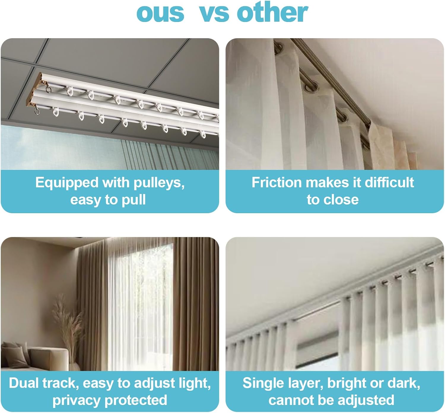 This double ceiling-mounted curtain track system is designed for smooth and quiet operation. Made from thickened aluminum alloy with a clean white finish, it supports heavy curtains while maintaining stable and low-noise performance. Ideal for bedrooms, hotels, RVs, and other spaces where silence, durability, and a clean ceiling look are preferred.