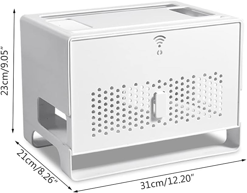 Double-layer Heat Dissipation Household Wifi Router Storage Box Removable Desk Socket Wire Box Description and Features This router storage box is suitable for WIFI router set tops, streaming media equipment, and other accessories.This shelf liberates your floor space, allowing your entertainment center to be better placed in the living room, family room, media room, study or office.The cable management on the back is a huge Keep your wires and accessories in order and Hollow engraving on all sides is beautiful, artistic and practical, good heat dissipation.Whole body of the rack is rounded and polished, while the is beautiful, it improves and effectively prevents bumps and scratches.Specification:Type: Router Storage Box Features Router Storage Box, Socket Wire Box, Strip Hidden Finishing Box Dimension: app.31x21x23cm/12.2x8.26x9.05inColor: for Grey, White (optional)Quantity: 1 PcNote:1.Please allow 0-1cm error due to manual measurement. pls make sure you do not mind before you bid.2.Due to the difference between different monitors, the picture may not reflect the actual color of the item. Thank you!Package includes:1 Pc x Router Storage Box
