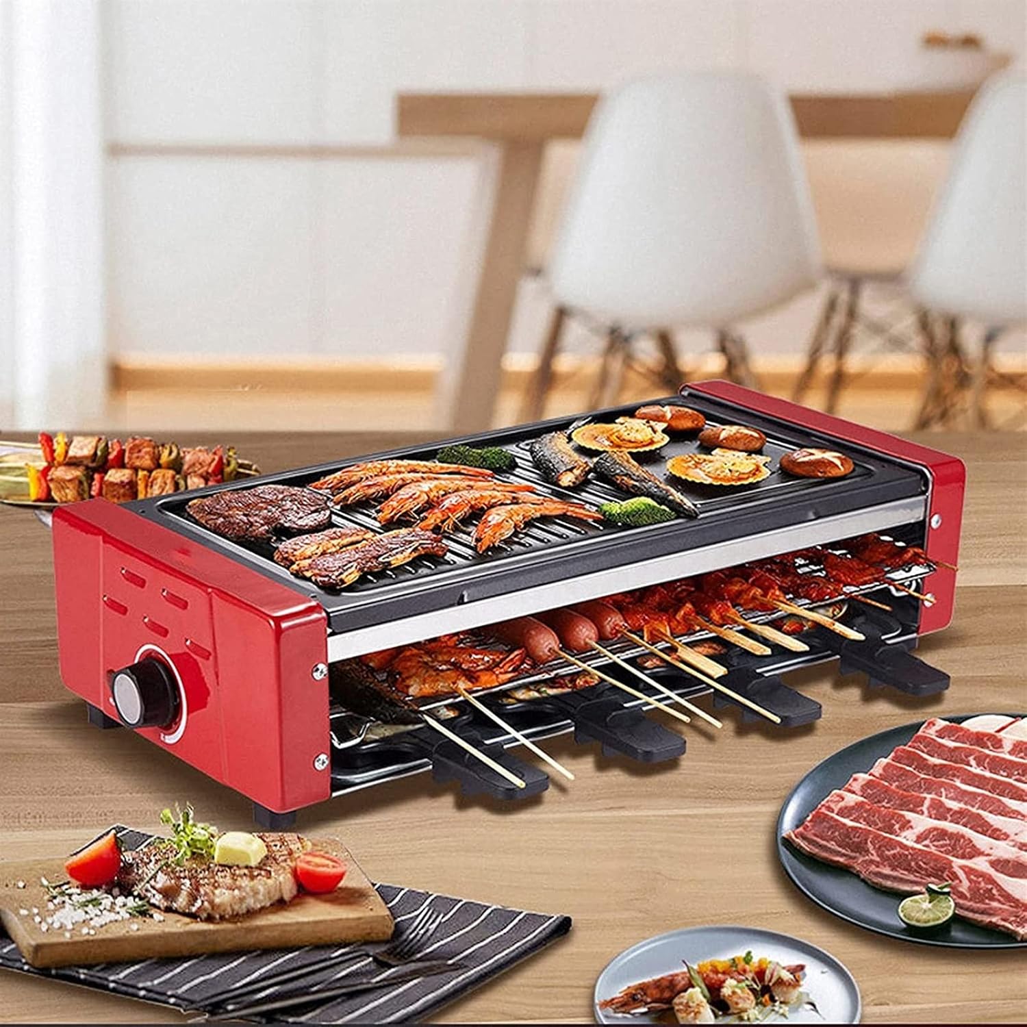 Features: Ideal smoke-free grill, coated with anti-sticking coating, very suitable for parties with friends and family, the electric grill with a power of 1500W can easily melt cheese and cook meat, vegetables and seafood in a few minutes. The product is equipped, A: 1* upper baking tray 1* lower baking tray 1* oil receiving tray, B: 1* baking tray 1* baking net 1* oil receiving tray, C: 1* baking tray 1* grilling net 1* oil pan 8* hand dish, the electric grill measures 52cm long and 22.5cm wide, suitable for 1-8 people The electric grill provides uniform heat, with a slotted and flat surface, which allows you to create a variety of delicious recipes, such as cooking meat, vegetables, seafood or sauces. Adjustable grill temperature is very suitable for various cooking options, grilling like a professional chef! the visible indicator light ensures that you will not forget to turn off the grill after finishing the operation. The non-stick coating makes it more convenient to use and easier to clean. moreover, the bakeware can be directly removed and cleaned without additional operations, which is very convenient. Specification: Rated voltage: 220V Rated power: 1500W Baking pan size: 520 * 227 * 125MM Temperature adjustment method: Infinite knob Suitable number: 1-8 People Note: Do not touch the baking tray when using it to avoid being burned by high temperature Package included: 1 * Double layer smokeless electric barbecue oven fter-sales protection: Welcome to our store, our store has many styles, you can log in to browse the store! If you have any doubts about the product, please send us an email, we will give you a satisfactory reply as soon as possible.