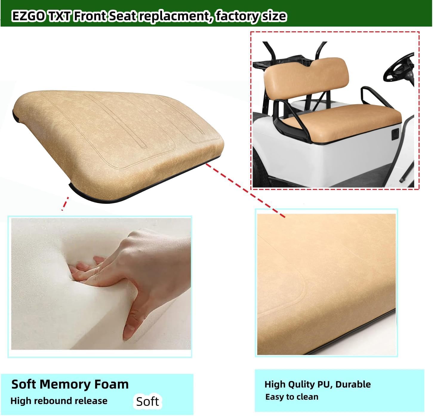 Golf Cart Front Seat Bottom Kit for EZGO TXT 1994-2013 Golf Cart, Factory Style Seat Cushions 1pieces. This golf cart seat foam replacement is made of high rebound memory foam material, absorbs impact and reduces vibration. Comfortable ergonomic seat, the seat leather is waterproof and not easy to wrinkle, long-lasting and durable. Replaces OEM Number: 71751-G01 71751-G03 71751-G04 71611-G02 71611-G06 71611-G08 The EZGO front seat replacement is PU leather surface, high effectively prevents rainwater from infiltrating, easy to wipe and clean. Refer to every size in the picture and compare yours carefully before buying. Hardware included.