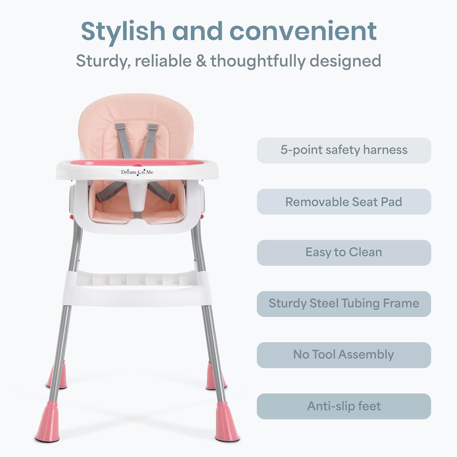 The Dream On Me TableTalk 2-in-1 High Chair is thoughtfully designed to grow with your child, seamlessly transitioning from a baby feeding chair to a toddler chair with the included conversion kit. Created with both comfort and convenience in mind, it features dual removable feeding trays—a color-coordinated, dishwasher-safe top tray for easy cleanup and a secure base tray for added stability during mealtime. The chair folds flat for compact storage, with the tray neatly stored on the back, making it ideal for homes where space matters. A padded, easy-to-clean seat and a secure 5-point safety harness ensure your child stays comfortable and supported at every stage. Built to meet all ASTM and CPSC safety standards, the TableTalk High Chair measures 38" H × 28" W × 23" D in high chair mode and 24" H × 17.5" W × 16" D as a junior chair. Suitable for children from 6 months to 3 years and supporting up to 33 lbs, it also includes a 1-year manufacturer warranty for added peace of mind.