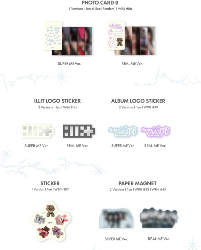 2 Package - Out Box + Photbook + CD-R + Photocard A (Random 1 out of 5) + Photocard B (Random 1 out of 5) + ILLIT LOGO Sticker + Album LOGO Sticker + Sticker+ Paper Magnet+ Paper Ornaments (Random 1set out of 5sets) + Poster With Lyrics Pre-order benefits will only be presented to products purchased during the pre-order period. We provide 100% authentic brand-new items from official manufacturers, delivered in sealed packaging. Outer case is to only protect inclusions inside therefore out box damages cannot be a reason for a RETURN or EXCHANGE. Please take an UN-BOXING video immediately after delivery in case there is a defect or missing item inside.