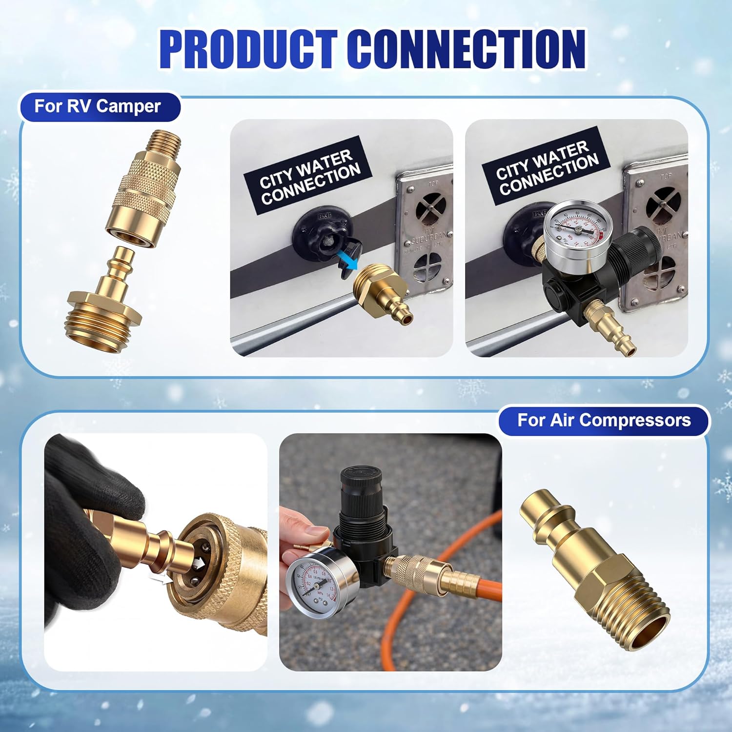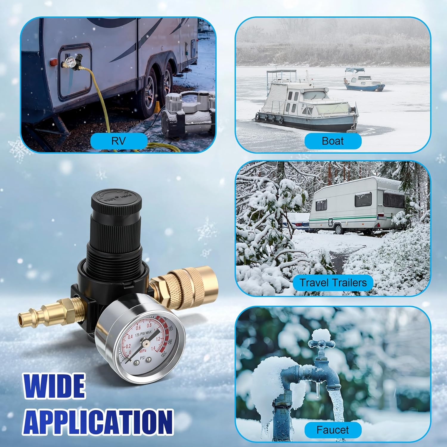 Frequently Asked QuestionsQ1: is this kit compatible with my air compressor? A1: yes. It works with most standard air compressors. Please make sure your air hose is compatible with the 1/4" quick connect fitting. Q2: will this kit prevent my RV pipes from freezing? A2: yes, it removes water from the RV tube system, effectively preventing freezing and pipe damage in cold weather. . Q3: can this be applied for boats or trailers? A3: yes. In addition to RVs, this kit can also be applied for boats, travel trailers, and similar tube systems that use standard city water connections. Q4: what pressure should I use to winterize my RV tube system? A4: the recommended operating pressure is around 30 PSI. Do not exceed 40 PSI, as higher pressure may damage RV plumbing or fittings. . Specification: Pressure Regulator &. GaugeMaterial: plasticColor: black, whitePlug KitMaterial: brassColor: copper . Package includes: . 1 x Pressure Regulator1 x 0- 200 PSI gauge1 x 1/4” Quick Connect Coupler (NPT)1 x 1/4” Quick Connect Stud (NPT)1 x 3/4 Blow Out PlugNote: . Do NOT use an unregulated air compressor directly. Do NOT exceed 40 PSI (recommended around 30 PSI). Do NOT connect to the fresh water tank inlet. Always watch the pressure gauge and increase pressure slowly.