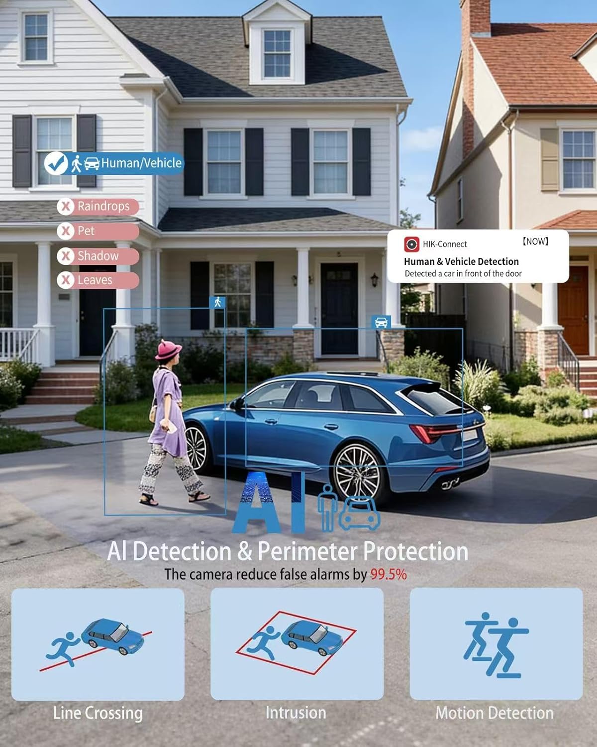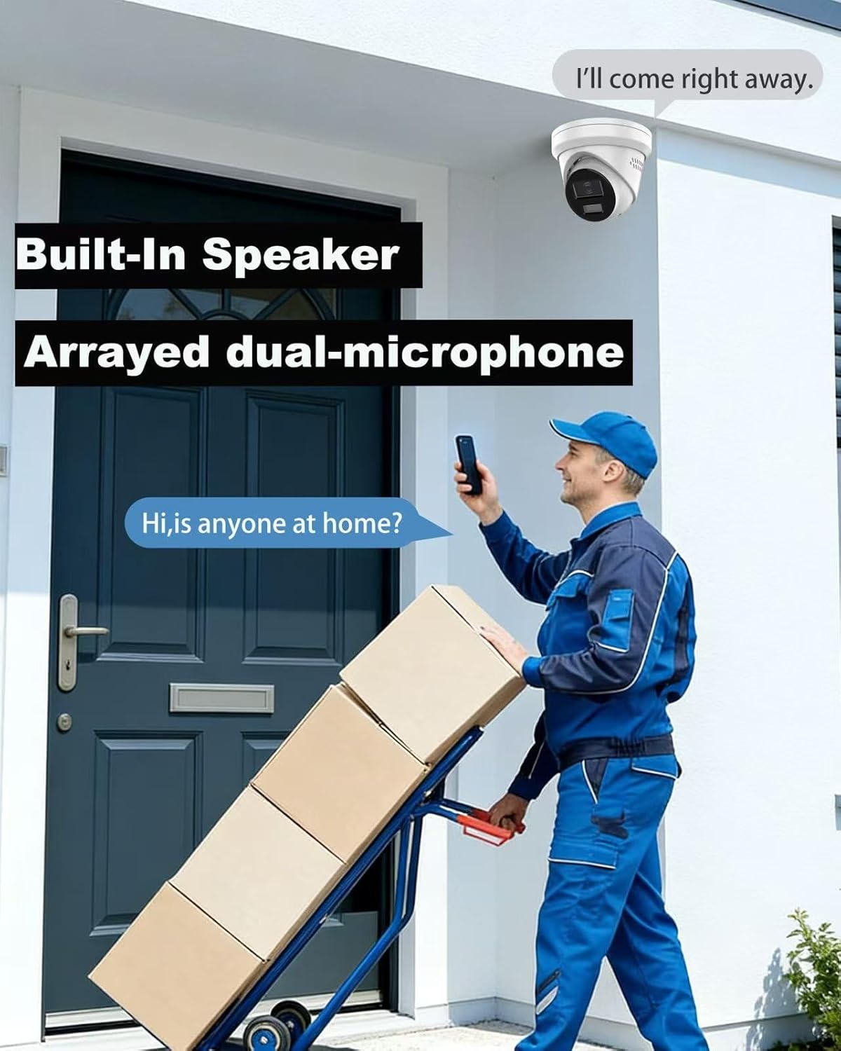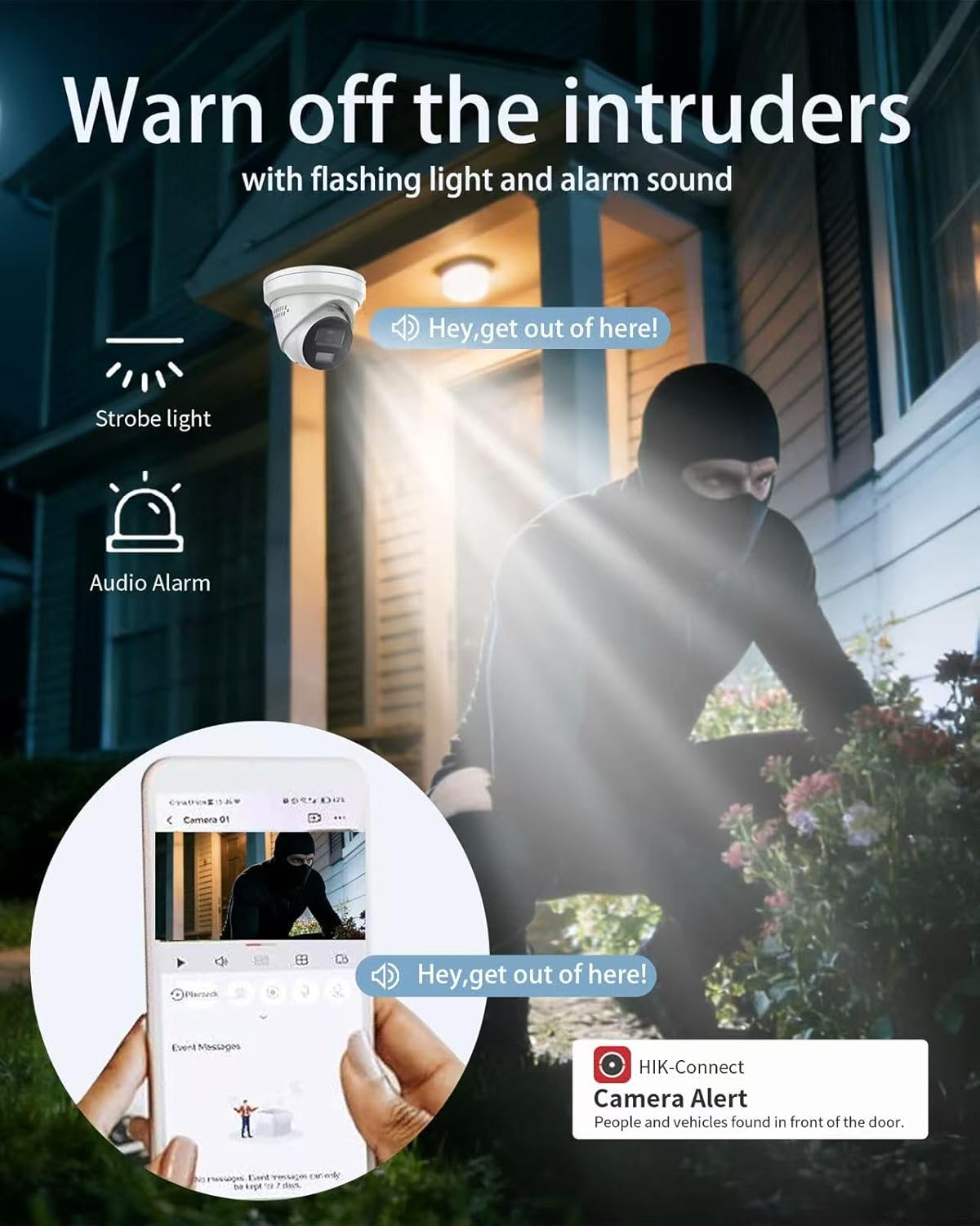 Crystal-Clear 4MP Security: See Your Home in Stunning Detail Upgrade your home or business security with our high-performance 4MP (2688 × 1520) camera. With a resolution that's 1.5 times clearer than standard 1080p, you'll capture every critical detail—from facial features to license plates. Whether it's day or night, this camera delivers vivid, accurate footage so you never miss a thing.Don't let darkness compromise your security. Equipped with advanced F1.6 aperture and a highly sensitive 1/3"" CMOS sensor, this camera captures crisp color video in near-total darkness with a minimum illumination of just 0.005 Lux. When light is completely absent, the built-in white light and 850nm IR illuminators seamlessly switch on, providing up to 100 feet (30 meters) of brilliant, smart-activated night vision. The ""Smart Supplement Light"" intelligently adjusts to ensure faces and objects are never overexposed, giving you clear, usable evidence around the clock.Advanced AI-Powered Detection: Get Alerts That Matter Say goodbye to false alarms triggered by passing cars or rustling leaves. This camera uses smart object recognition to distinguish between humans and vehicles. Set up customizable Perimeter Protection—like line crossing or intrusion detection—and receive instant notifications only when it matters. The advanced face detection feature adds an extra layer of security for identifying visitors or potential threats. Link these events to email alerts, FTP uploads, or trigger the built-in speaker and strobe light for an immediate audible and visual deterrent.Experience true two-way communication. The integrated arrayed dual-microphone captures clear, high-quality audio from every direction, while the powerful 110 dB built-in speaker lets you project your voice. Greet visitors at your front door, warn off an intruder, or simply check in on family and pets—all from your smartphone.Engineered for challenging lighting conditions, the camera features 120 dB True Wide Dynamic Range (WDR). This technology balances the brightest and darkest areas of a scene, so you can see clearly even in high-contrast environments like a sunny doorway or a room with a bright window. Combined with 3D DNR (Digital Noise Reduction), you get clean, sharp video with minimal noise, even in low light.Installation is a breeze with complete 3-axis adjustment (pan, tilt, and rotate), allowing you to position the camera perfectly for any angle. Its sleek, durable metal housing is built to withstand the elements, ensuring reliable performance year after year. You have the flexibility to power it via a standard 12V DC source or use a single-cable solution with PoE (IEEE 802.3at), simplifying setup and keeping cables tidy.Your data and privacy are protected by enterprise-grade security features, including HTTPS encryption, IP address filtering, and comprehensive password protection. You can store footage locally on a microSD card (up to 512GB, not included) or securely back it up to a NAS device. With support for the Hik-Connect app, you can view live feeds, playback recordings, and manage your system from anywhere in the world, right from your smartphone or tablet.Take control of your property's security today with crystal-clear video, smart detection, and reliable performance.