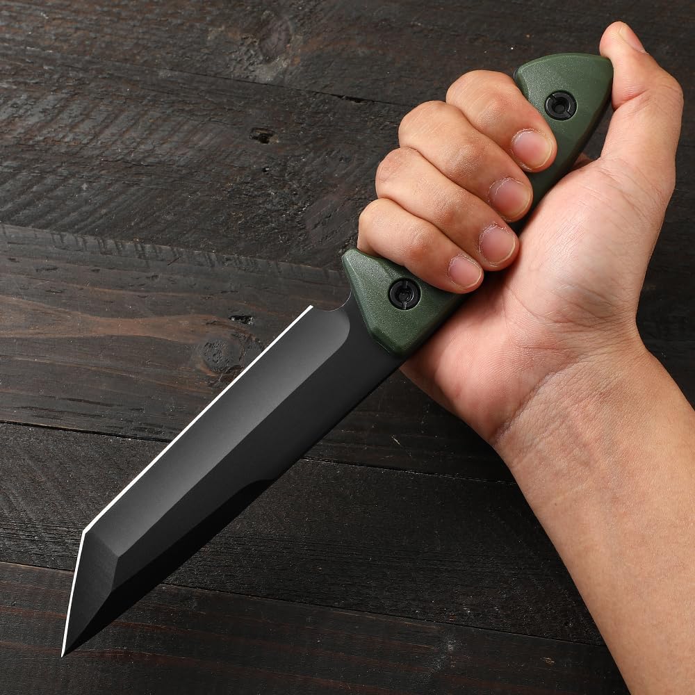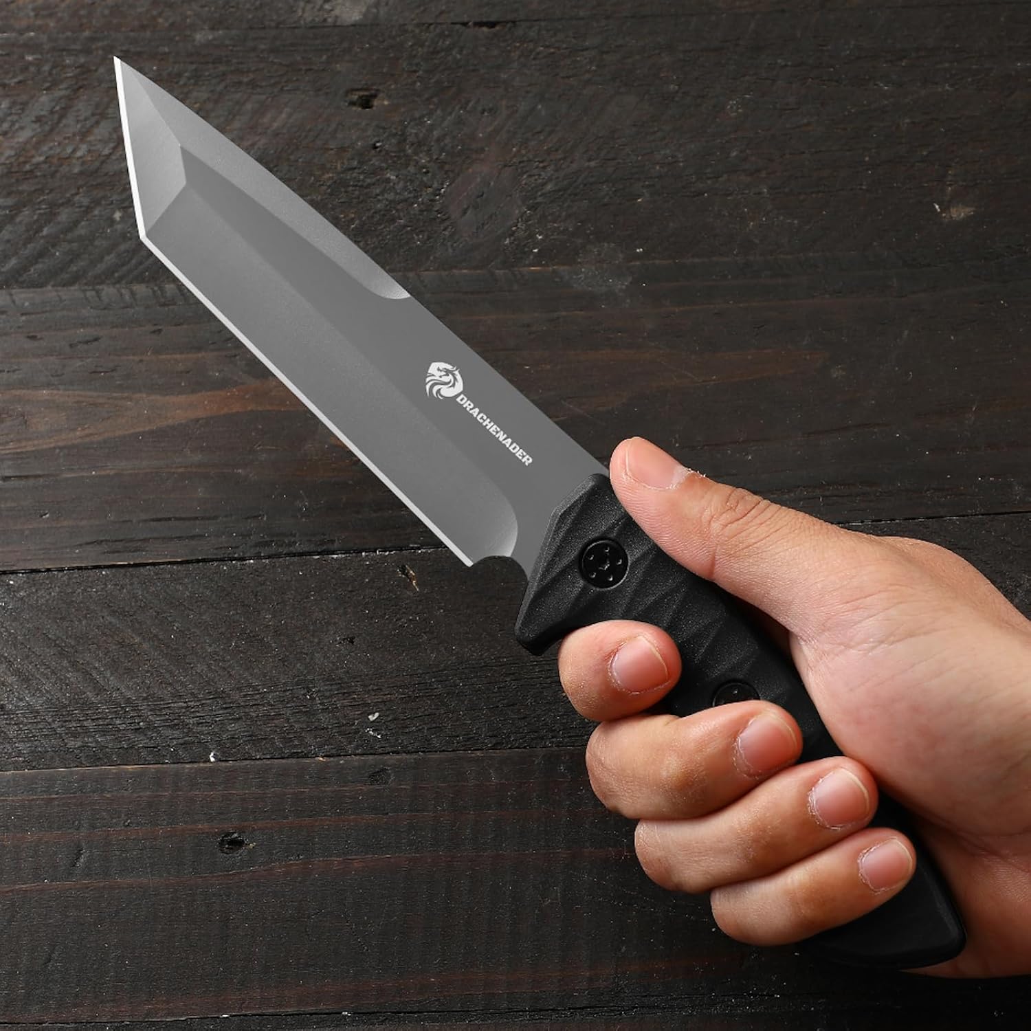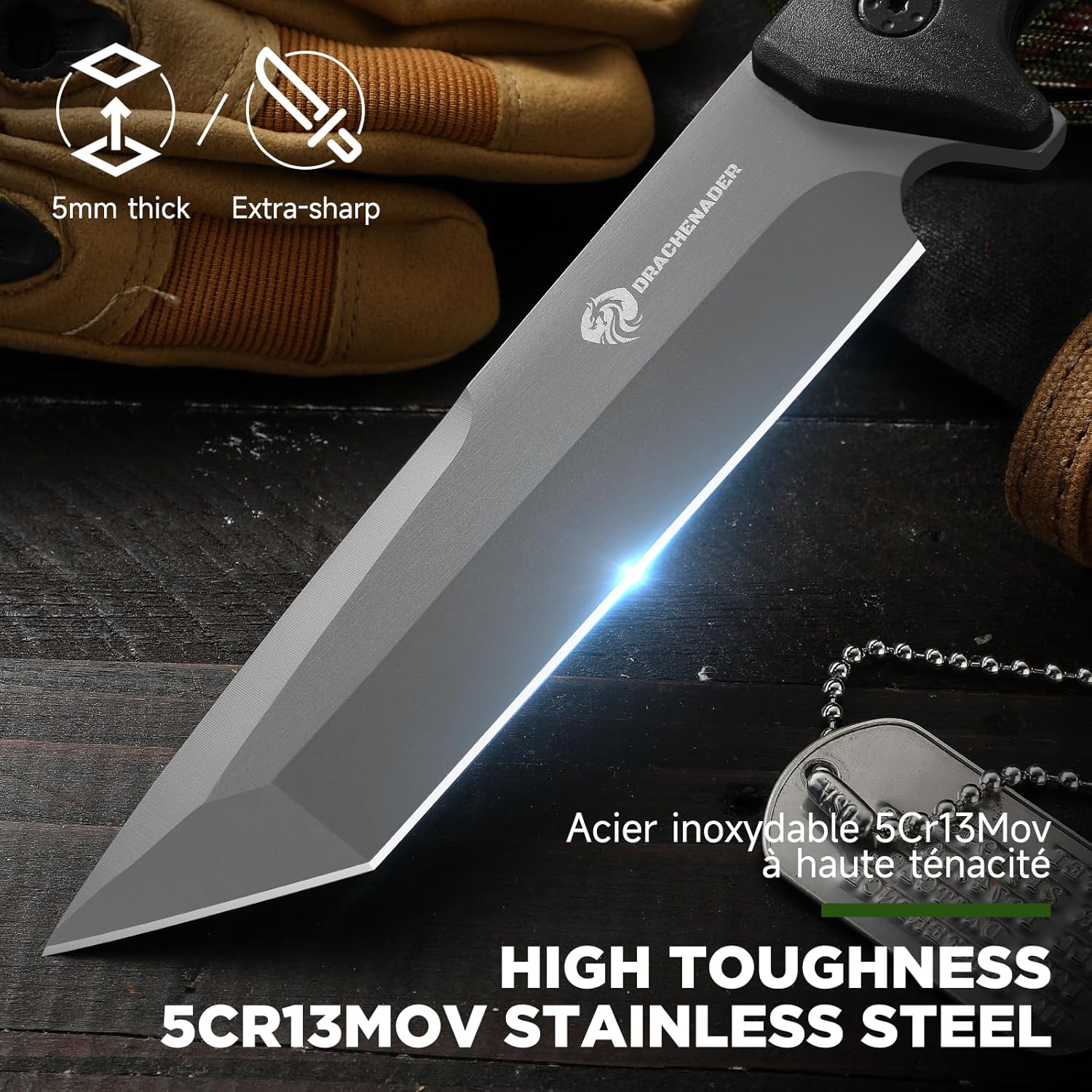 Discover the DRACHENADER Tanto Knife Set, a versatile duo designed for outdoor enthusiasts and survivalists. This set includes two high-performance fixed blade knives, one in sleek black-green and the other in classic black-white. Both knives feature robust 5mm thick steel blades and full tang construction for exceptional strength and durability. The included ABS sheaths provide secure and adaptable carrying options. Each knife measures 26 cm (10.24 inches) overall, with a 14 cm (5.43 inches) blade, making them ideal for various tasks in the wild.