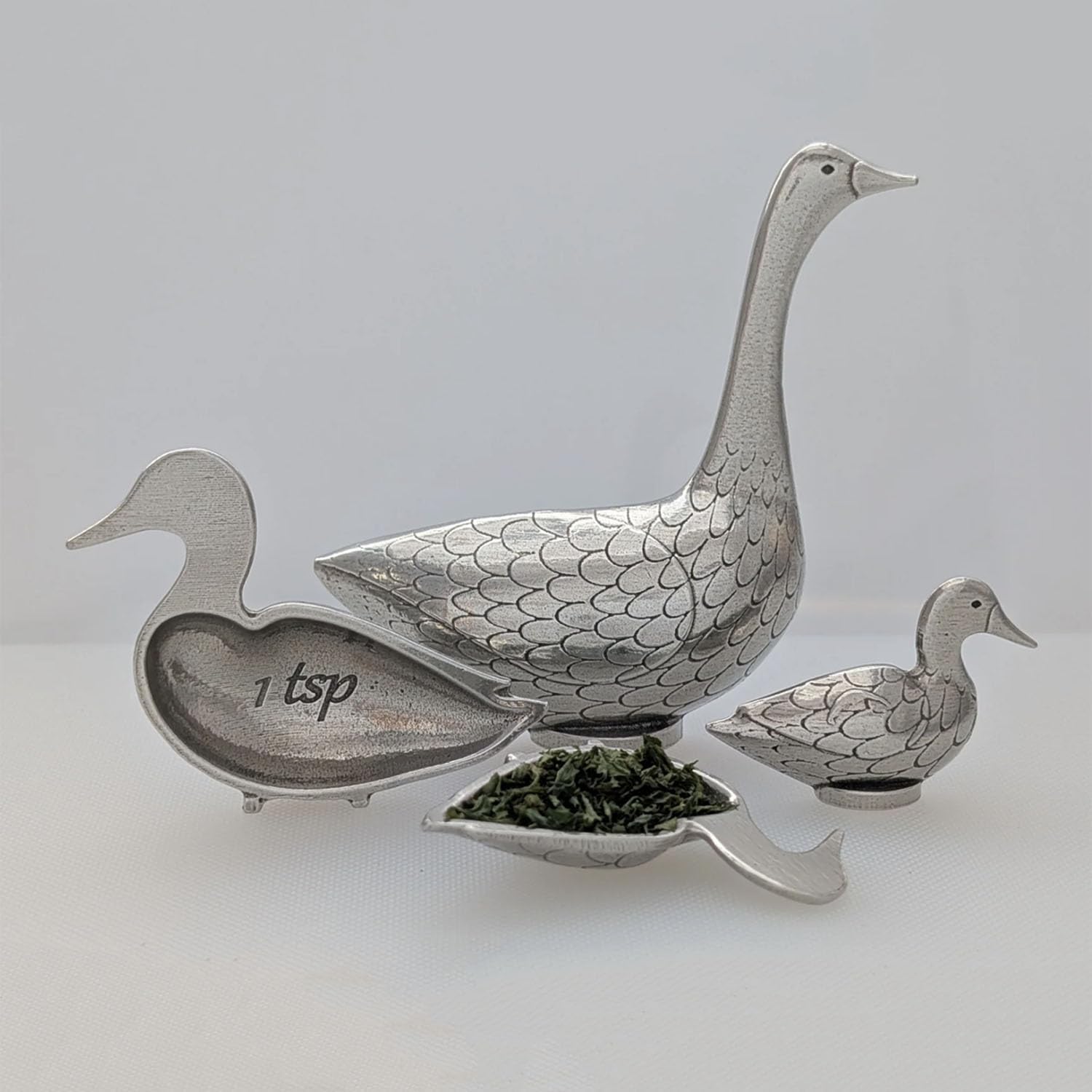 A delightful gaggle inspired by the childhood pastime, these heirloom-quality measuring spoons will be a timeless addition to your kitchen. Cast in pewter and polished to a luster, they're made to last. Age and use will bring out a rich patina. Wash by hand to maintain a pristine finish, and use pewter polish, if desired.Roosfoos is the work of pewter artisan Tim Rooseboom. From his Oregon studio, he creates intriguing designs that transform mundane objects into something extraordinary. He uses only the finest quality, lead-free American pewter, and all his kitchen accessories are food-safe.
