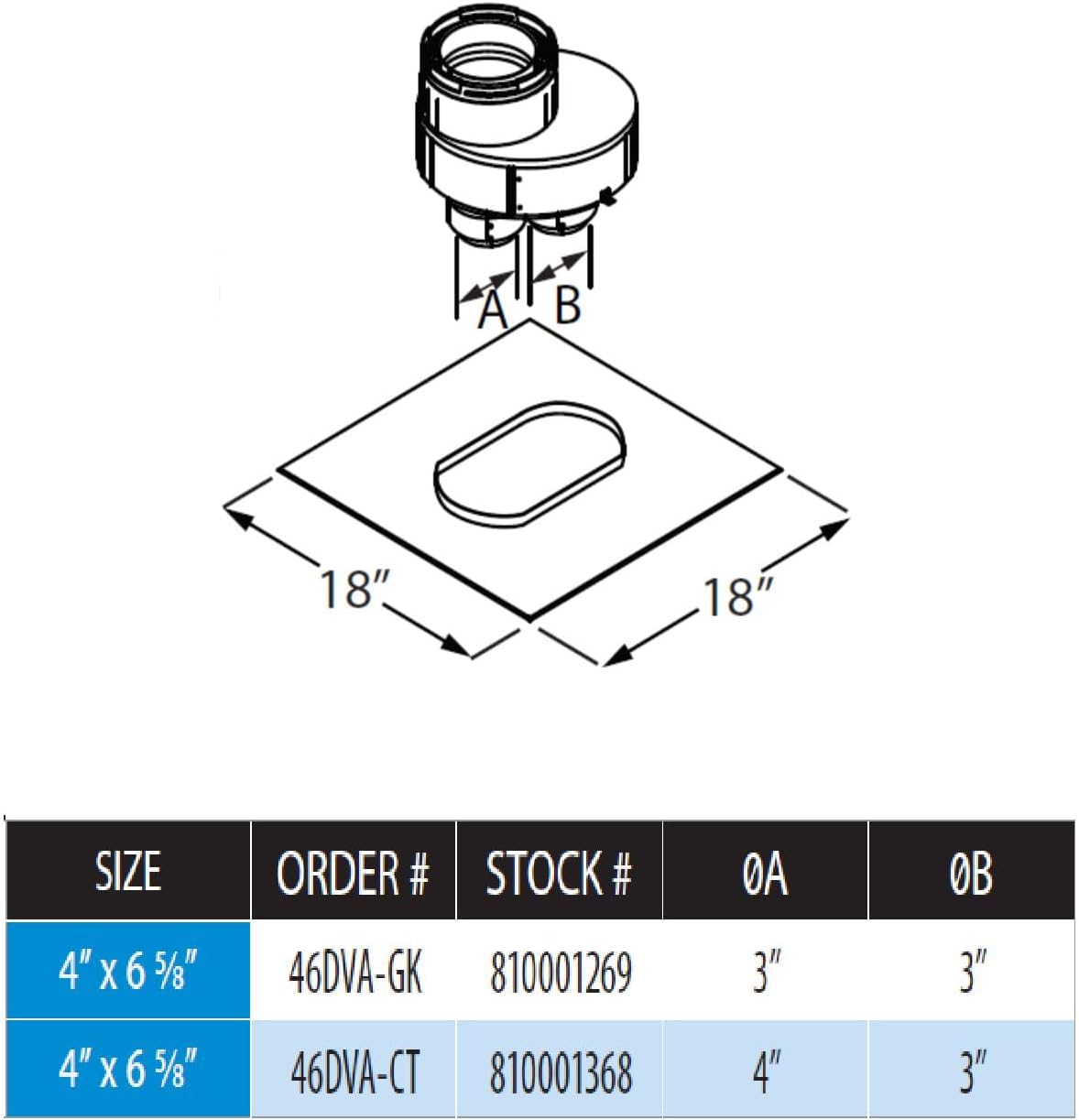 The DirectVent Pro 4" x 6-5/8" Galvanized Chimney Liner Termination Kit is a component that is used in a typical venting installation. The chimney liner termination kit includes a termination connector and flashing. DirectVent Pro 4"x6-5/8" termination caps, 3" flex, and co-linear flex connectors are sold separately. The DirectVent Pro chimney liner termination kit must be tested and listed for each appliance. Refer to stove manufacturer's installation instructions. Includes: Termination Connector and Flashing. Features: Type: Termination Kit. Collection: DirectVent Pro. Used in a Typical Venting Installation. UL Listed. Specifications: Overall Dimensions: 18" (W) x 18" (D) .