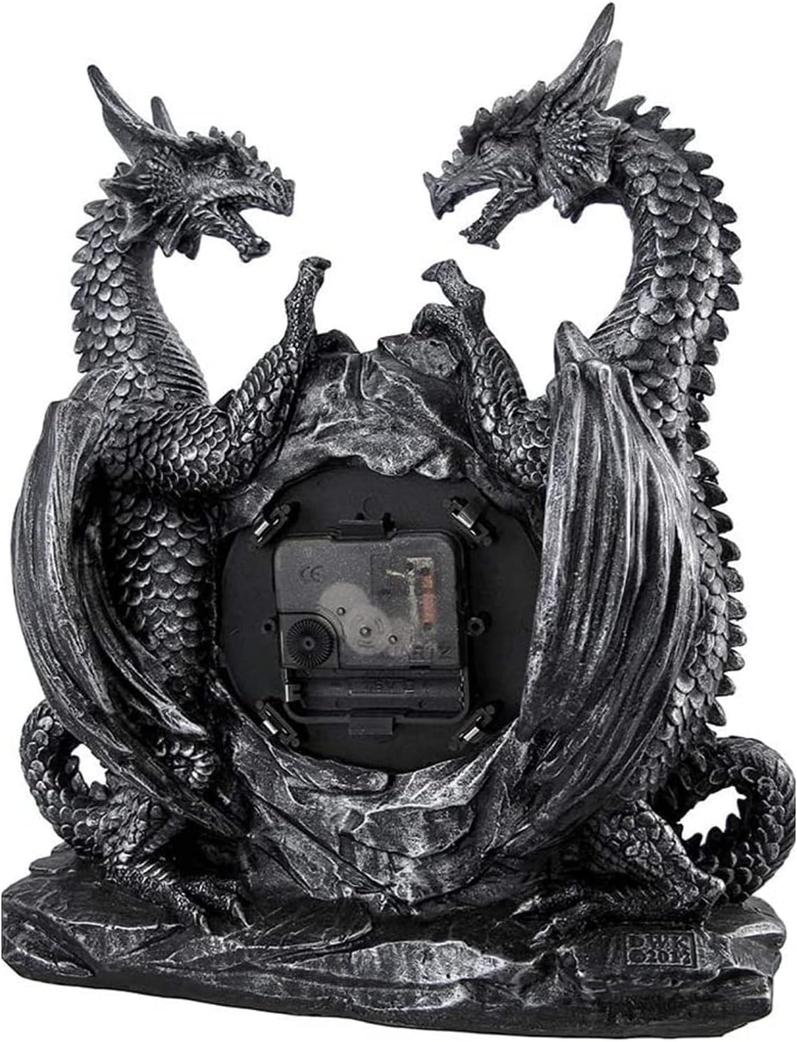 Enhance your space with the Twin Evil Dragons Antique Mantel Clock, a captivating piece for fans of gothic, medieval, and fantasy decor. Crafted from durable cold cast resin, this battery-powered clock features intricately detailed dragons guarding an antiqued clock face, creating an alluring centerpiece for mantels, desks, or shelves. Standing at 11.25 inches tall and 10 inches wide, it's the perfect addition to living rooms, home offices, or bedrooms. Ideal for collectors and enthusiasts, this clock makes a thoughtful gift and an edgy, artistic touch to any room. Requires one AA battery (not included).