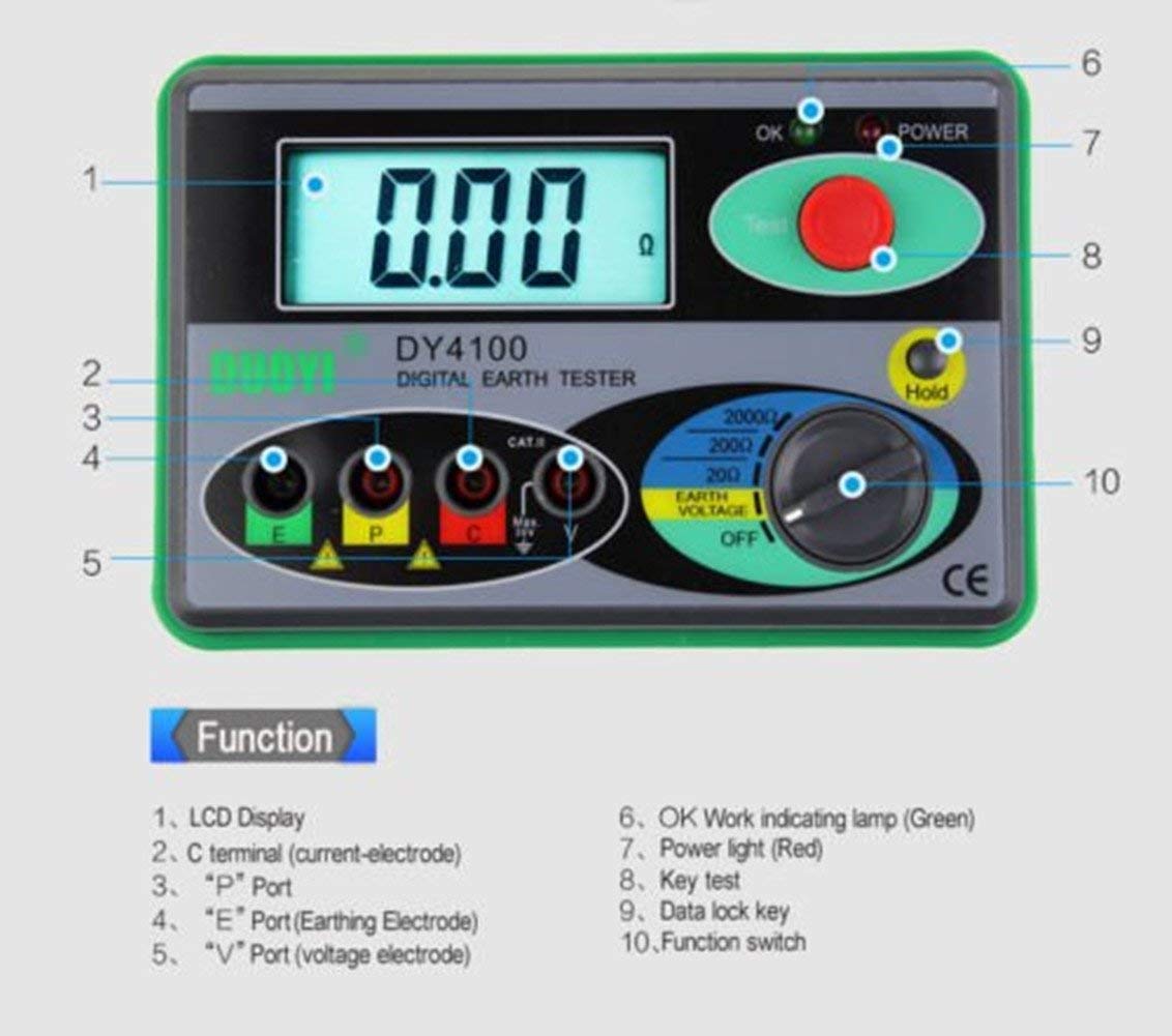 1.DY4100 Digital Ground Resistance Tester can test earth resistance of various earth systems including power systems, electric equipments, lightning conductors as well as resistance value of low resistance conductor and AC voltage test. 2.This one has more complete functions, higher accuracy, more convenient and reliable for operation and more suitable for outdoor use with dust and wet proof structure. Feature1. Earth Ground Resistance: 0/20/200/2000Ω 2. Resolution: 0.01 3. Earth Voltage:0~30V +/-3% + 5 4. Data Hold 5. Function Symbol Display 6. Automatic Range7. Low Battery Warning 8. Power: AA 1.5V x 6(UM3)12v x 1(not include) 9. Size:150 x 100 x 70mm 10. Weight: Approx. 680g Package includes: 1 x Set of DY4100 Digital Earth Ground Resistance Tester