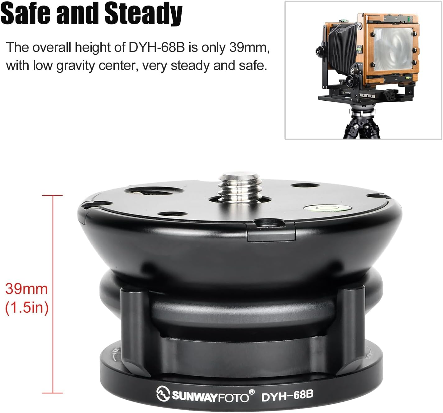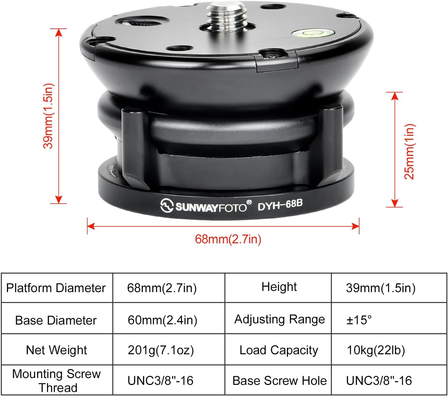 Model: DYH-68B Main body Material: Aluminum T6061 Tilting Range: +/- 15° Camera Screw Thread: 3/8” Screw Thread Tripod Mounting Screw Thread: 3/8” Inner Thread Platform Diameter: 2.7in./68mm Base Diameter: 2.4in./60mm Height: 1.54in./39mm Weight:7.09 oz/201 G Max Load Capacity:22.0 lb./10.0Kgs.