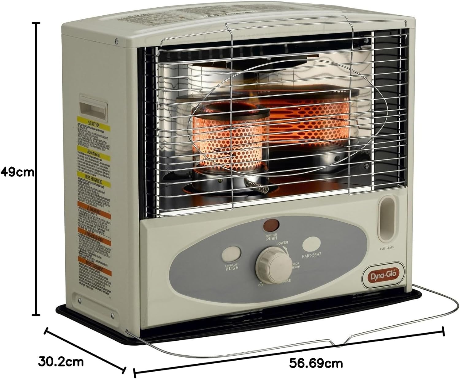 The Dyna-Glo Indoor Kerosene Radiant Heater is a great choice for safe supplemental indoor heating. Perfect for use in your home, basement, garage, or cabin. Because it does not use electricity, it makes a great choice for emergency heating when the power goes out, as well as everyday zone heating. Uses only 1-K kerosene. Burns with 99.9% efficiency, 13 hours on one full gallon-tank of fuel. Automatic pushbutton ignition with simple one-touch extinguish feature. Fuel tank is easy to lift out and has an easy-to-read fuel gauge. Safety grille, cool-top design and tip-over shutoff help reduce accidents. Includes siphon pump and batteries. Not available in CA, MA and NY. Use in accordance with local codes and ordinances. Dependable - Ideal for emergency use or daily use Economical - Cut heating bills by warming only occupied areas Convenient - Easy to use automatic ignition and one-touch shut-off Safe - Built-in safety switch shuts power off if unit is knocked over Versatile - Use in workshops, basements, cottages, RVs, and more Extended Comfort - Operates 13 hours on one full tank of kerosene