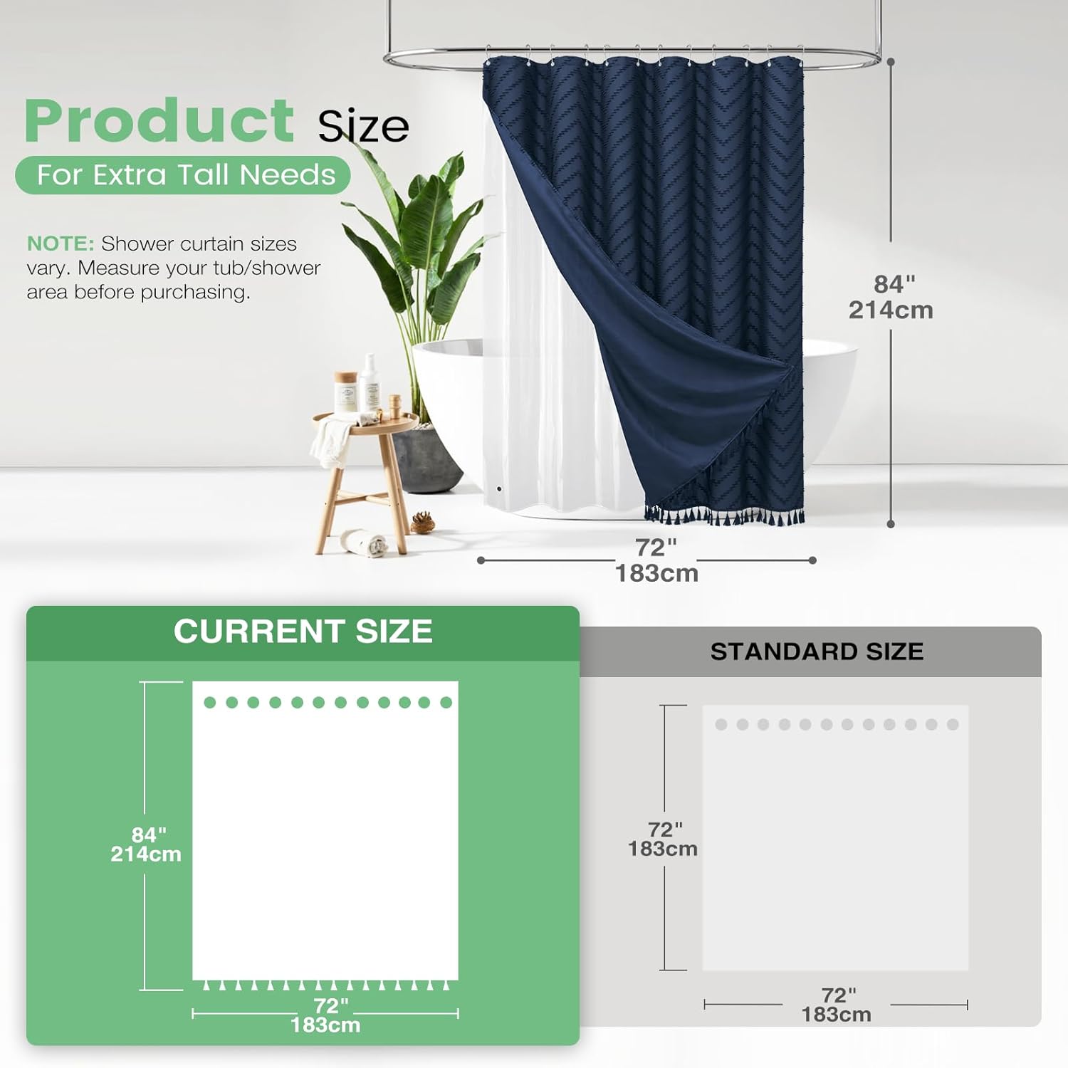 Navy Fabric 3-in-1 Shower Curtain Set: 72 x 84, 12 rust-resistant grommets.This navy shower curtain set includes 1 Navy Boho Shower Curtain, 1 Clear PEVA Liner and 12 Plastic Hooks. Boho Farmhouse Shower Curtain: This navy boho farmhouse shower curtain for bathroom is suitable for diverse decoration styles, like modern farmhouse, contemporary, simple, bohemian, shabby chic styles. Waterproof Fabric, This water repellent fabric shower curtain with clear PEVA liner is 100% waterproof. This liner also features three magnets that attach to the bathtub. Shabby Chic & Minimalist Style: Its classic design suits numerous settings, from teen bathroom, apartment, spa, hotel, camper, outdoor, RV, college dorm, preppy dorm, athletic club, gym