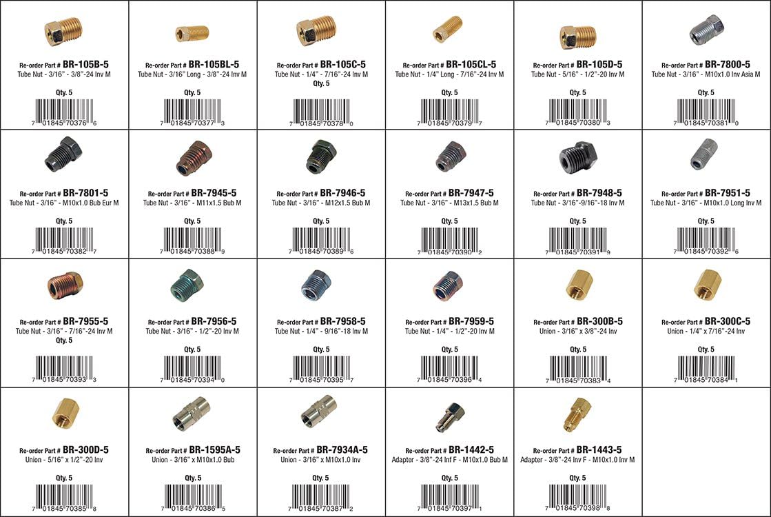 Profit and productivity always take a hit when inexpensive service parts are not readily available. Trying to locate, source or wait for delivery of a low cost item results in idle service bays, wasted technician time and lost profit. And, without a system to keep those parts organized, easy to find and easy to reorder, your service parts inventory can evolve into a collection of half-used kits, duplicated assortments, obsolete parts and wasted money. The JohnDow Automotive Service Parts Assortments program solves these problems. Johnno has combined the most popular small service parts in key service categories with an innovative and easy-to-use storage and organizing system. It is designed to save the professional installer time and money by making key service parts readily available and affordable. QTY 5 of the Following: Gold Clr Zinc Plating | Tube: 1/4" | Thread: 1/2"-20" Inverted RoHS Yellow Zinc Plating |Tube: 1/4" | Thread: 7/26"-24 Long Inverted RoHS Yellow Zinc Plating |Tube: 1/4" | Thread: 7/26"-24 Short Inverted Blue Clr Zinc Plating | Tube: 1/4" | Thread: 9/16"-18 Inverted Green Clr Zinc Plating | Tube: 3/16" | Thread: 1/2"-20" Inverted RoHS Yellow Zinc Plating |Tube: 3/16" | Thread: 3/8"-24 Long Inverted RoHS Yellow Zinc Plating |Tube: 3/16" | Thread: 3/8"-24 Short Inverted Red Clr Zinc Plating | Tube: 3/16" | Thread: 7/16"-24 Inverted Olive Clr Zinc Plating | Tube: 3/16" | Thread: 9/16"-18 Inverted Olive Clr Zinc Plating | Tube: 3/16" | Thread: M10 x 1.0 Bubble Blue Clr Zinc Plating | Tube: 3/16" | Thread: M10 x 1.0 Inverted Blue Clr Zinc Plating | Tube: 3/16" | Thread: M10 x 1.0 Long Inverted Orange Clr Zinc Plating | Tube: 3/16" | Thread: M11 x 1.5 Bubble Blue Clr Zinc Plating | Tube: 3/16" | Thread: M12 x 1.25 Bubble Green Clr Zinc Plating | Tube: 3/16" | Thread: M13 x 1.5 Bubble RoHS Yellow Zinc Plating |Tube: 5/16" | Thread: 1/2"-20 Inverted Tube: 1/4" | Thread: 3/8"-24 | Flare: Inverted Tube: 1/4" | Thread: 7/16"-24 | Flare: Inverted Tube: 3/16" | Thread: M10 x 1.0 (European) | Flare: Bubble Tube: 3/16" | Thread: M10 x 1.0 | Flare: Inverted Tube: 5/16" | Thread: 1/2"-20 | Flare: Inverted Brass | Female: 3/8"-24 Inverted | Male: 10mm*1.0 Bubble | Tube: 3/16" Brass | Female: 3/8"-24 Inverted | Male: 10mm*1.0 Inverted | Tube: 3/16"