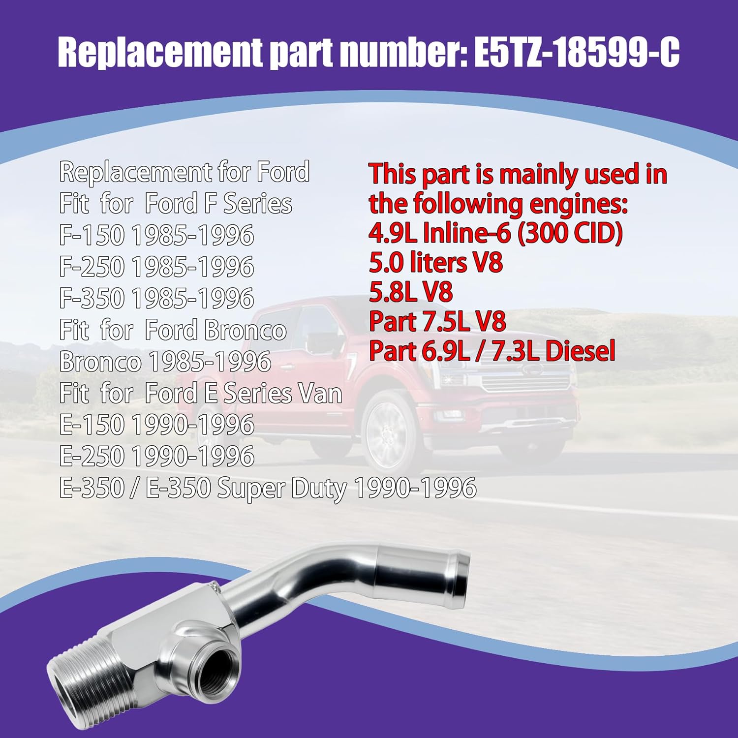 E5TZ-18599-C Coolant Temperature Sensor Elbow Connector Tube This coolant temperature sensor elbow connector tube is designed for the engine cooling system and provides a secure connection between the coolant temperature sensor and heater hose assembly. The connector tube helps maintain proper coolant flow while supporting accurate temperature monitoring for the engine. Strong and Reliable Construction Manufactured from high-strength metal material, the connector tube is designed for demanding engine cooling environments and maintains stable performance during long-term operation. Precision Connection Design The connector tube is produced with accurate thread and hose connection specifications to ensure proper installation with the coolant temperature sensor and related cooling system components. Maintain Cooling System Operation By providing a stable connection path between the coolant temperature sensor and the heater hose system, this part helps maintain consistent coolant circulation and supports normal engine temperature monitoring. Compatible Vehicles Replacement for Ford F-150 1985-1996 F-250 1985-1996 F-350 1985-1996 Bronco 1985-1996 E-150 1990-1996 E-250 1990-1996 E-350 1990-1996 Engine Compatibility: 4.9L Inline-6 5.0L V8 5.8L V8 Installation Steps Remove the original coolant sensor elbow connector tube. Clean the connection area and check the sensor threads. Install the new connector tube and tighten securely. Reconnect the coolant temperature sensor and heater hose. Check the cooling system to ensure proper installation.