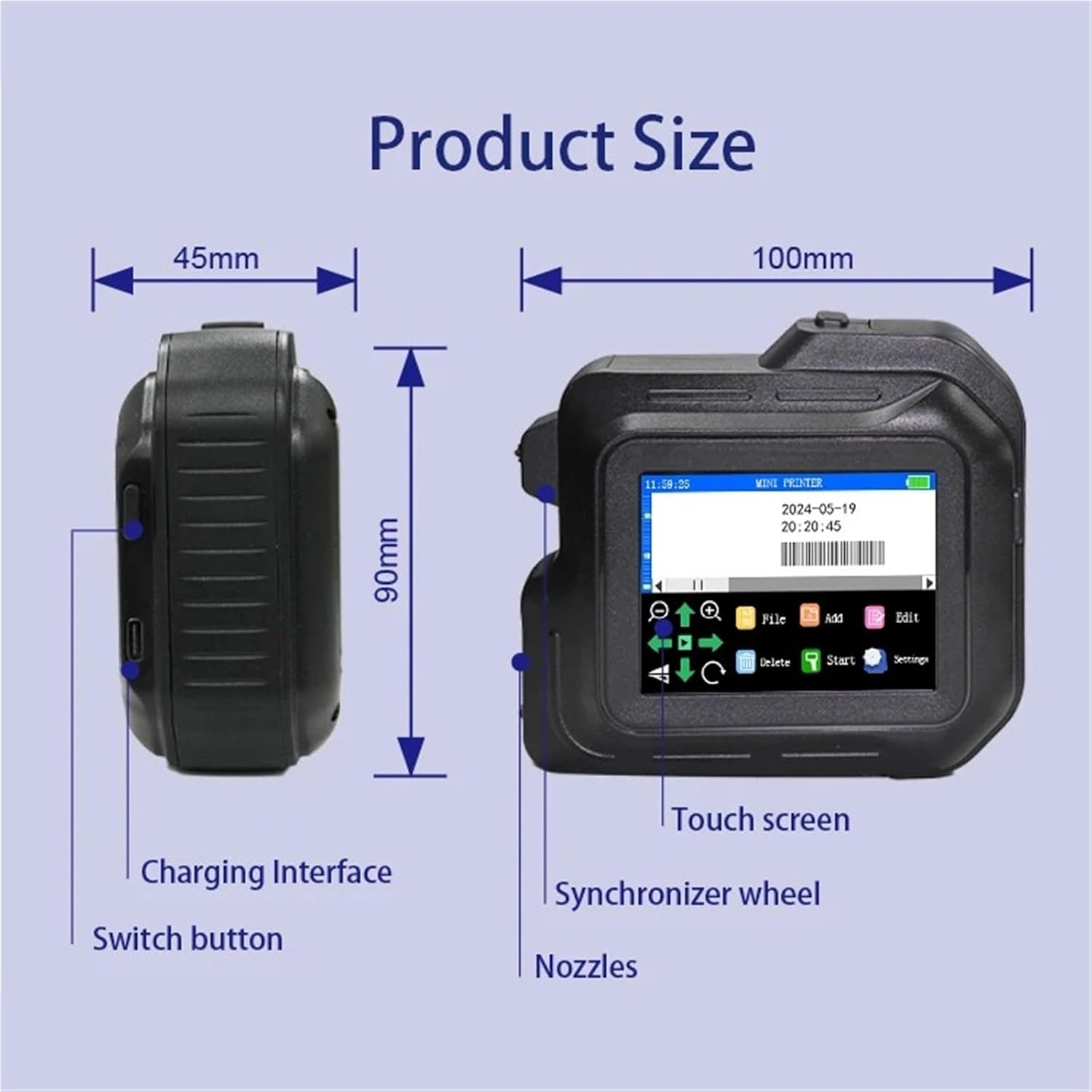 Product Description:Product Name: Mini Inkjet printerRated Rating: 25wCartridge Type: 12.7mmPower Supply Mode: Fast Charge 3.0 AdapterPrint Resolution: 600dpi MaximumPrinting Distance: 2-5mmPower Input: DC-9V/2ACharging Interface: Type-CProduct Weight: 245gProduct Size: 97*70*45mmSystem Language: 28 LanguagesPrinting Height: 2-12.7mmPrint Content: Time, Date, Counter, QR code, Barcode, Logo, etc.Printing Material: Wood, Carton, Pipe, Cable, Metal, Plastic, Uneven surface, etc.
