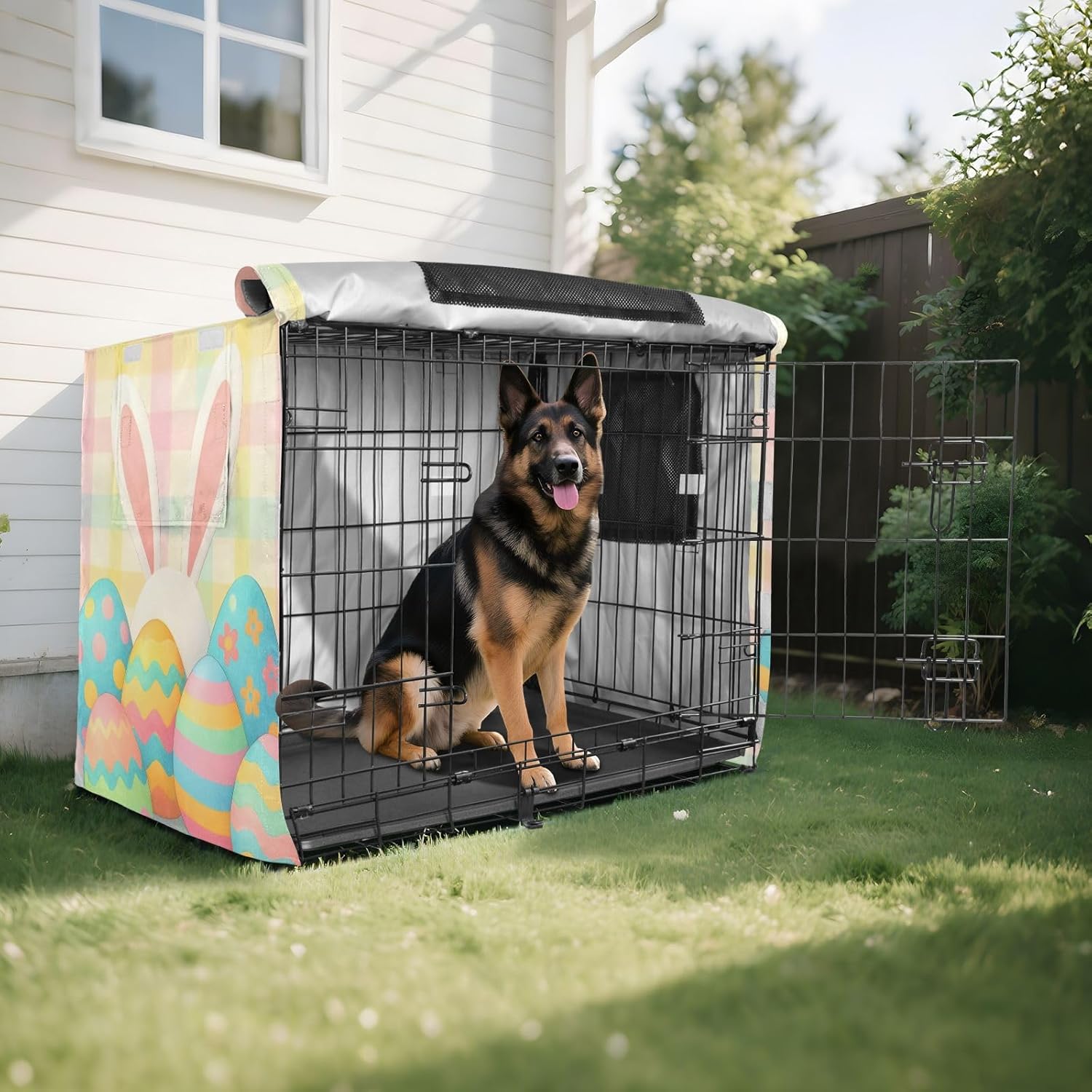 Premium Protection – Constructed from 600D silver-coated oxford fabric, this foldable crate cover offers excellent protection from rain, wind, and sunlight. It helps prevent scratching and keeps your pet’s crate protected from external elements.Quick Setup – This breathable pet cage cover is designed for easy installation, with a simple fastening system that ensures a secure fit without the need for tools or extra help.Mesh Windows for Comfort – This dog cage cover includes mesh windows on all sides, promoting airflow to keep your dog cool and comfortable while providing privacy and a sense of security inside the crate.Secure and Stable – With four tie-down straps at the bottom, this pet crate cover remains securely in place, even during windy conditions. This feature ensures that your dog’s crate is stable and protected from the elements.Flexible Usage – This pet cage cover is suitable for both indoor and outdoor use, making it a Ideal solution for protecting your pet's crate whether at home, during travel, or on outdoor adventures.