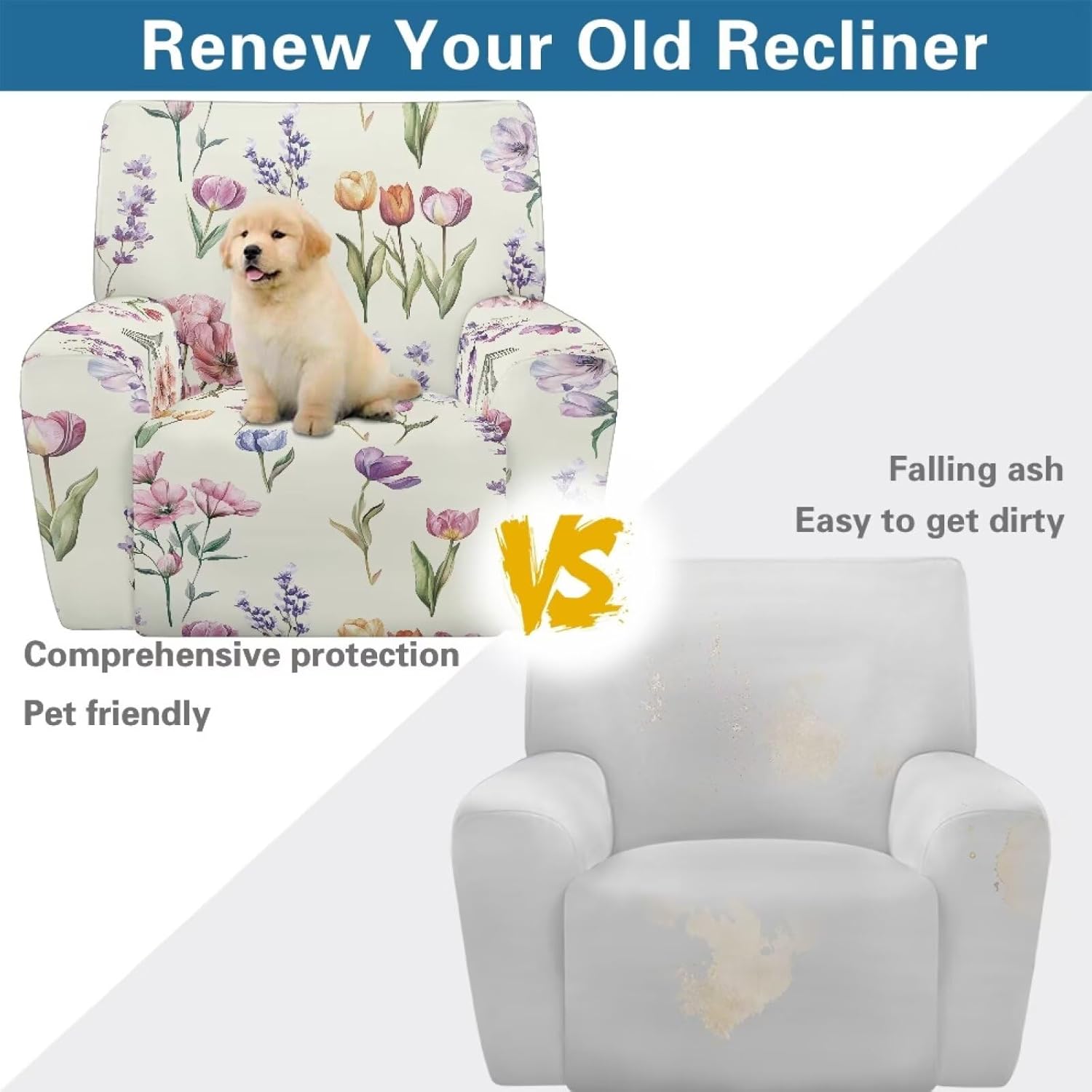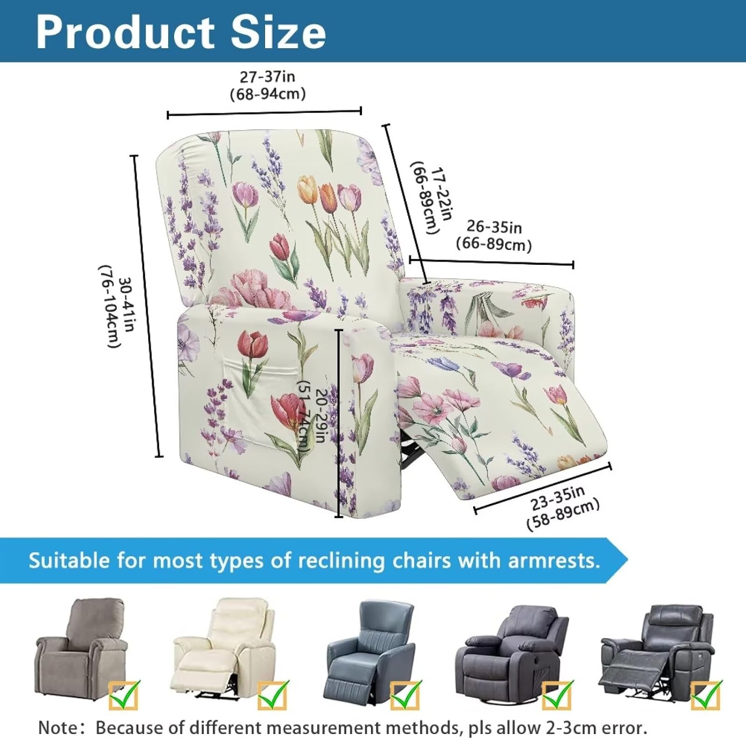 【Material Composition】Polyester+Spandex【Design Features】Full elastic edge with secure straps for non-slip fitIntegrated armrest covers with functional storage pocketsStretch fabric conforms to chair shape without wrinkling【Protection Performance】Resists spills, stains, and pet damageDurable construction prevents fading and wear【Size Specifications】Fits recliners 26in-35in Depth x 27in-37in Width x 30in-41in Height, Measure your recliner's depth, width, and height before ordering.【Usage Scenarios】Ideal for living rooms, apartments, and pet-friendly households. Perfect for refreshing old furniture or protecting new investments. Suitable for most recliner styles with arms.【Note】 Because of different measurement methods, pls allow 1in error.