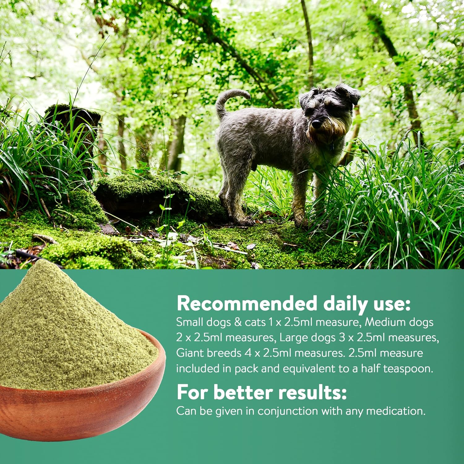 Easy Green Powder supplement offers the power of 'super-greens' in a convenient powder form. Simply mix with your pet's regular food to provide them with the benefits of eating greens, without any leafy greens. The swift air-drying process preserves maximum nutrients in an easily digestible form, naturally enhancing levels of iron, vitamin C, chlorophyll, calcium, magnesium, and antioxidants for overall health. Additionally, it has cooling properties to soothe pets with hot, itchy skin.