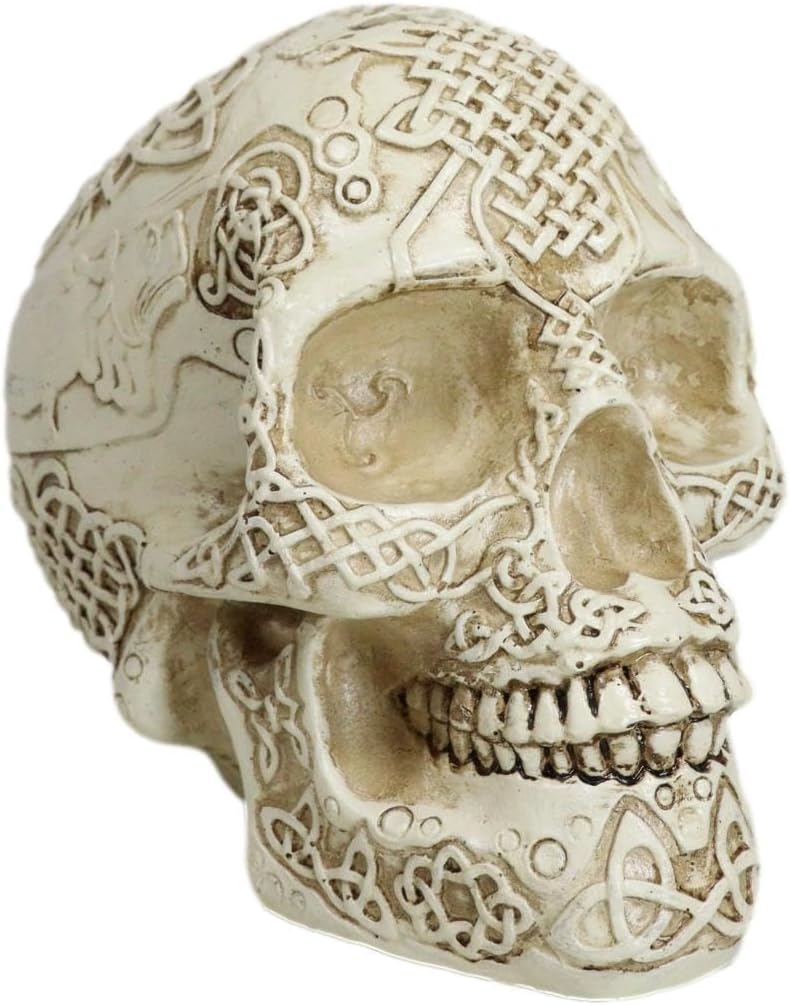 This Celtic Lion Savings Bank is a great addition to any skull collection. Shaped like an ornately decorated human skull, this savings bank creates a regal display while helping you keep your loose change neatly stored away. Shaped like a human skull, it features a brilliant green coloration intricately decorated with golden knotworks and a Celtic lion beast wrapping around its side. This Shamrock Irish Green Celtic Skull Money Bank measures approximately 5.5"Tall. 7"Long and 4"Deep. It weighs about 1.25 pounds.