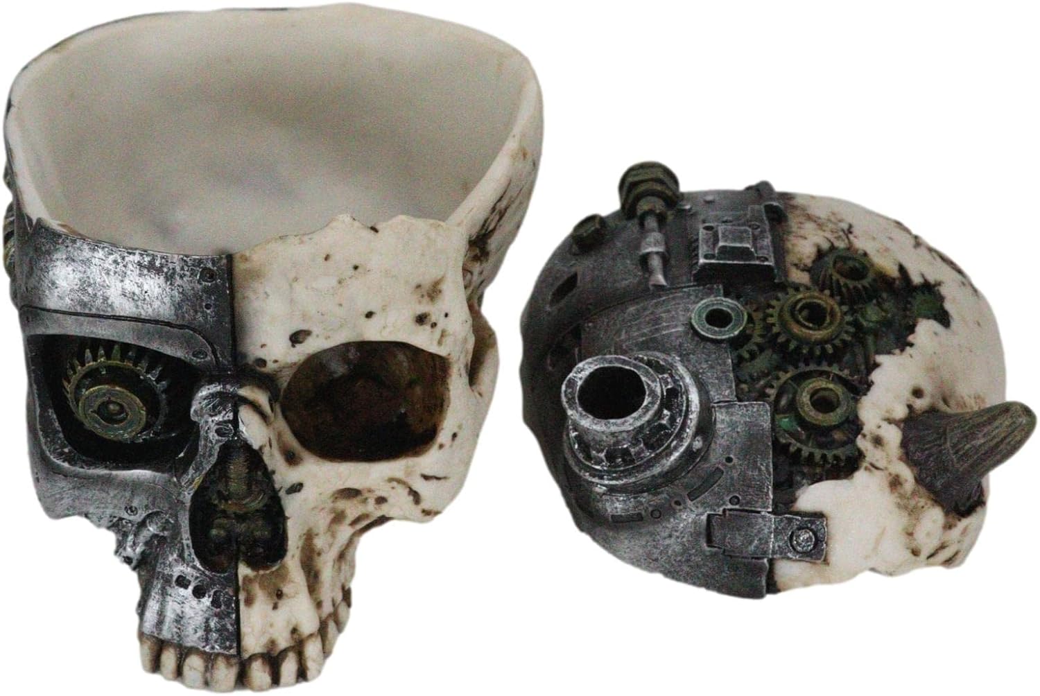 This Steampunk Demon Cyborg Skull Serves as a trinket/jewelry box or as ashtray. This Steampunk Demonic skull features a two faced skull. Half of him is a robotic steampunk demon while the other is a demon creature. The top part of the head opens as lid. He is an ultra cool futuristic skull to own or give away!