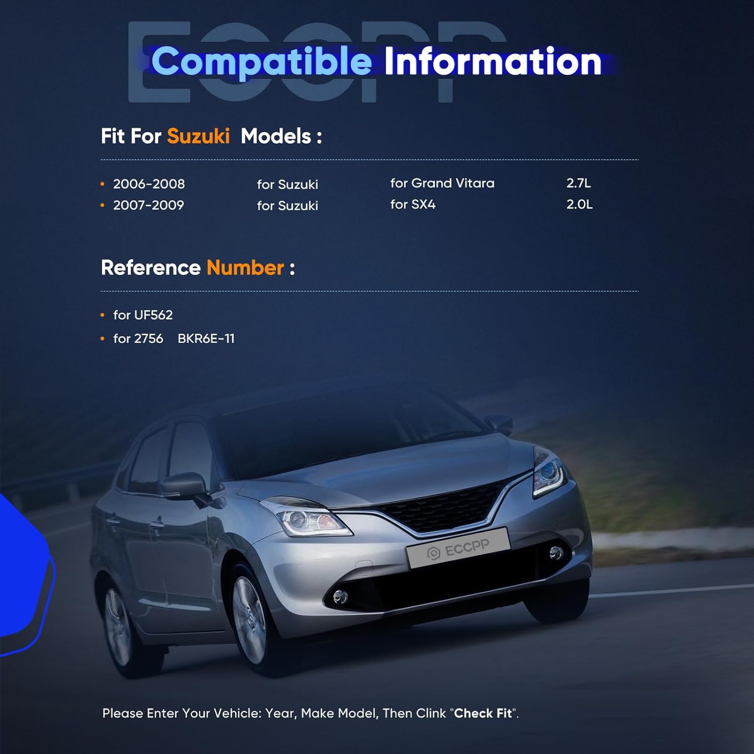 | Part Interchange Info | Direct replacement for OEM part numbers UF562, 5C1785, E1062, 52-2140, IC642, 33400-65J00, C1728 in Suzuki SX4 2007-2009 and Grand Vitara 2006-2008 models. |