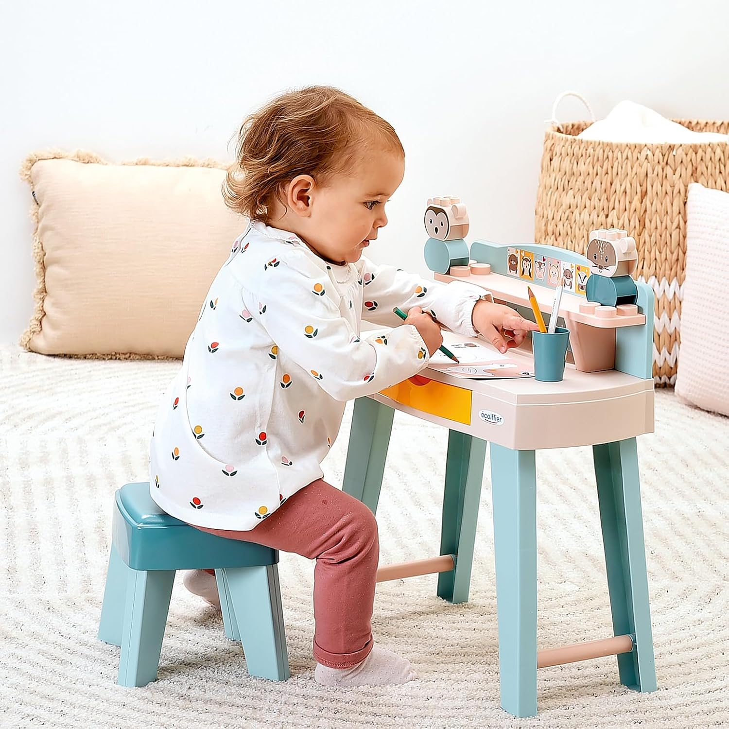Desk and stool set in soft colors to make these first coloring pages like a big one. 2 small brick companions are there to accompany your child in their creativity! (Pencil not included) From 12 to 36 months. Origin France Guarantee