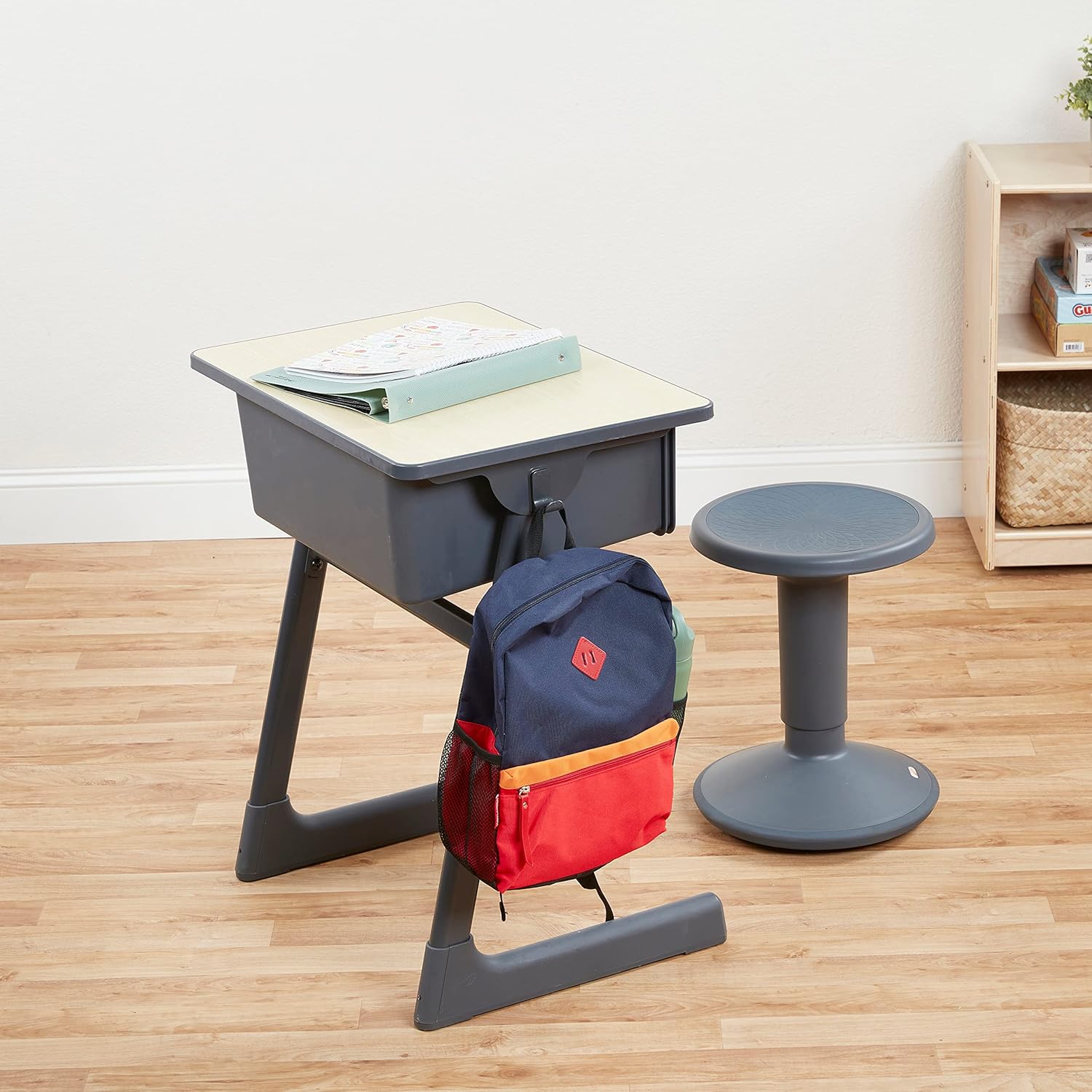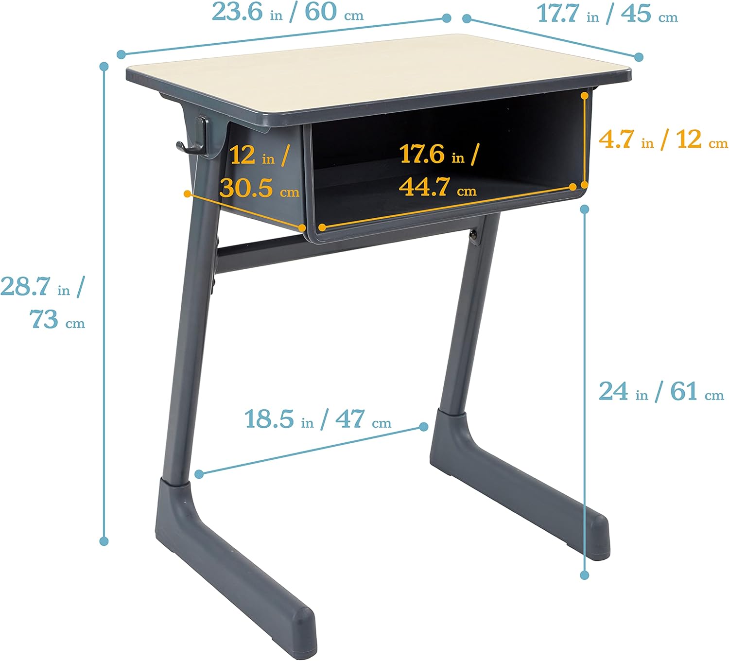 The Cave Open Front Desk is the perfect addition to schools, classrooms and home learning spaces. This student desk is designed with a cantilever frame that provides ergonomic support and gives learners ample leg room. The base is free of any low crossbars making it easy to keep your floors clear and free of clutter. A spacious plastic book box with a built-in pencil groove helps you stay organized by holding textbooks, folders, papers and writing utensils. Two hooks keep backpacks and personal belongings organized. Constructed with high-quality materials to withstand everyday use, the durable tabletop is finished with an edge banding that provides added protection against dirt and moisture. Angled legs have a rubber foot base and adjustable leveling glides that provide stability and protect your flooring. Desk is easy to clean by wiping down with a mild soap-and-water solution or your favorite bleach-free wipe. Arrives ready-to-assemble and requires minimal adult assembly.