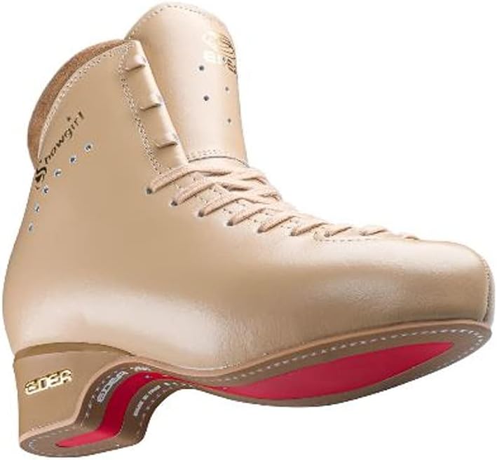 The EDEA ShowGirl Skate is a new take on the traditional Flamenco Ice. The ShowGirl is a beautiful Tan Skate especially designed by Skates U.S. for the rigors of show skating. The EDEA ShowGirl Skate is the Ultimate Skating Boot for Show Skating, High-Level Competitive Ice Dance, Roller Long Figures, and Inline FreeStyle Roller Skating where a great Toe Point is desired. The ShowGirl Skate is made with Revolutionary NEW Ultra Lightweight Materials, which means the ShowGirl Skate is about 25% to 45% lighter than comparable traditional leather Skating Boots. Some of the core features are: The Strength of a Concerto (and also the Flamenco Ice) for the ladies doing strong jumps in Shows; A Low-Cut Back with a Tan Cuff that is just a couple of millimeters taller than the standard Flamenco Ice for that extra strength and support for jumping, while especially allowing a wonderful toe point while being incredibly comfortable; The anatomically shaped Memory Foam padding will remember your foot, provide support and especially deliver comfort; The Tongue is like the Concerto in strength, padding, and feeling; The EDEA ShowGirl Skate, like all EDEA skates, are very comfortable and lightweight and use the Thermoformable Structure for support and strength. The EDEA ShowGirl Skate can be “Custom Shaped” for that perfect fit, by qualified Skates U.S.- EDEA Dealers or Skates U.S. directly; The unique EDEA Footbed is torsionally rigid but with just a bit of vertical compression, that creates a lower center of gravity in the Skate, creating a lower displacement which greatly increases stability and control. The Footbed and bottom cover will not absorb moisture and WILL Securely hold the special EDEA screws, mounting the Ice Blades; That Great Italian Design with a twist to a passionate Red inlaid waterproof Sole and imbedded crystals, both on the side and in the arch of the Red Sole for that beautiful, functional, and adds that final touch of elegance.