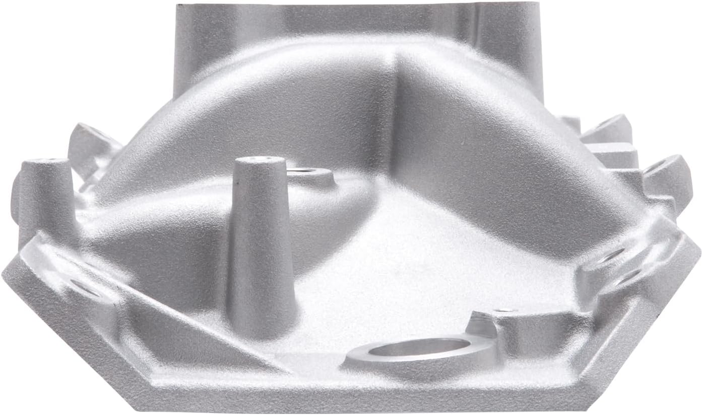 Designed for spread-bore carbs but also works with Edelbrock square-bore carbs without adapter on street 396-502 c.i.d. Chevy V8's with large oval-port (1975 and earlier) heads. No provisions for hot air style chokes. Accepts divorced choke, late-model water neck, air-conditioning, alternator and HEI equipment.