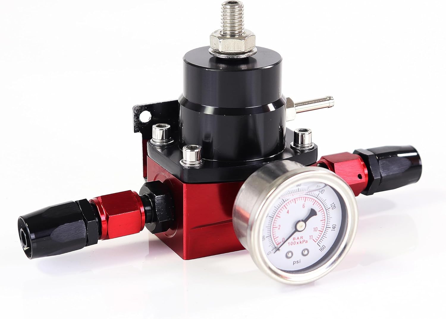 [Function]: The purpose of a fuel pressure regulator is to maintain a consistent pressure of fuel at the engine [Package]: Includes 1xfuel pressure regulator, 1xpressure gauge, 1x6an port plug, 3x6an straight adapters, 3x6an 90-degree adapters, 1xfuel rail adapter, 1xfuel regulator bracket, 3x6an fuel line
