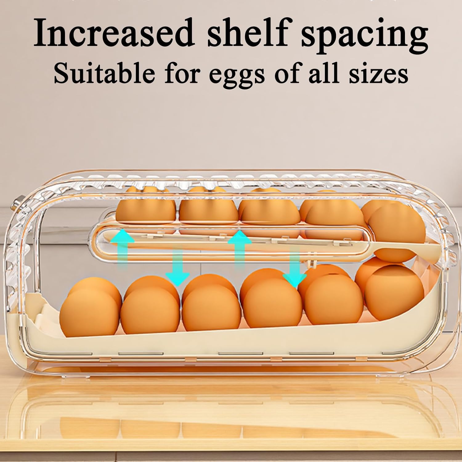 Egg Storage for Refrigerator Organizer provides a practical solution for managing eggs in any space. Featuring a 2-tier design with automatic rolling functionality, this dispenser ensures easy access while keeping eggs secure. The container includes handles for effortless portability and is stackable to maximize vertical storage. Ideal for home kitchens, countertops, pantries, cabinets, or even apartments, restaurants, farmhouses, and camping trips. This egg storage system simplifies organization by providing a dedicated space for eggs, promoting efficiency in daily tasks. Durable construction ensures reliable performance in various environments. Enhance your kitchen and pantry setup with this versatile egg organizer designed to streamline storage needs effortlessly.SpecificationProduct name: Egg storage boxMaterial: PPColor: transparent, blueProduct weight: 1.5kgProduct size: about 32x17x14cm/12.6x6.69x5.51 inchesListEgg storage box x1Note:1. Due to lighting effects and display angles, there may be color differences in the product.2. Due to manual measurement, there may be errors in product size, please understand.