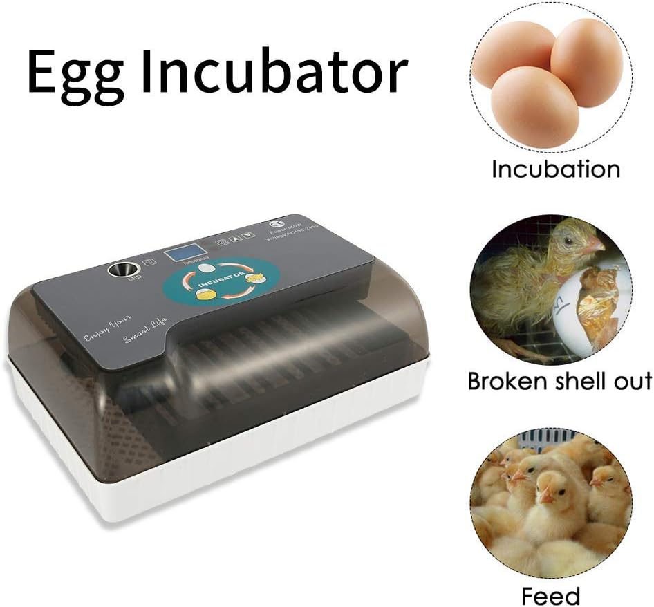 Color: Gray + White. Voltage: 220 V Power: ≤40W Dimensions: about 32 x 21 x 11.7 cm Weight: about 1.2 kg. Egg Capacity: 12 eggs, 9 duck eggs, 4 goose eggs, 4 pigeon eggs, 35 quail eggs. Package Included: 1 x incubator. 1 x power cord. 1 x user manual.