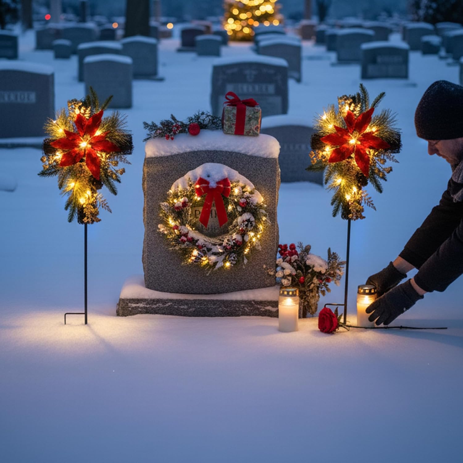 Bring light, warmth, and remembrance to your holiday season with this Poinsettia Solar Christmas Cross Garden Stake Light. Classic red poinsettia flowers, pine needles, golden berries, and warm white LEDs create a serene and heartfelt display for Christmas. Powered entirely by the sun, the built-in automatic on/off turns lights on at dusk and off at dawnโno wiring or electricity required. Place the cross in a sunny location to fully charge during the day and enjoy up to 6โ8 hours of soft illumination at night. Built with all-weather, waterproof materials, including a waterproof solar panel and LED light string, it withstands rain, snow, and harsh winter conditions for reliable outdoor use. Whether displayed in a cemetery, memorial garden, front yard, or lawn, this lighted cross blends festive beauty with meaningful remembrance. Itโs a thoughtful sympathy gift and a timeless Christmas decoration that brings comfort and peace throughout the holiday season.