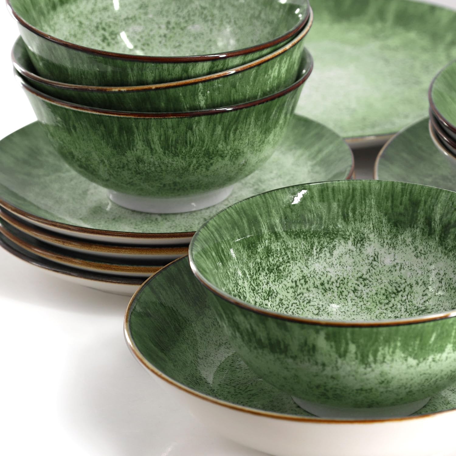 The Elama Oceanus 16 Piece Porcelain Double Bowl Dinnerware Set embodies elegance and practicality for any dining occasion. Crafted from high-quality porcelain, each piece is finished with a beautiful glaze that accentuates the unique color variation print on each piece. Whether serving a cozy family meal or hosting a formal dinner party, this set seamlessly blends functionality with aesthetic appeal. The Oceanus collection includes four dinner plates, four salad plates, four cereal bowls, and four dinner bowls, all designed to withstand daily use while retaining their pristine finish. With its ocean-inspired color palette of greens and whites, this dinnerware set brings a touch of coastal charm to your dining experience, making every meal an occasion to savor. Ideal for both casual dining and special gatherings, the Elama Oceanus set not only impresses with its visual appeal but also promises durability and convenience. Including two different bowl styles allows for effortless serving of soups, salads, and desserts alongside main courses, ensuring a harmonious presentation at the table. Each piece is dishwasher and microwave safe, offering practicality for modern lifestyles. Whether you're enjoying a leisurely breakfast or hosting a festive celebration, the Oceanus set elevates your dining experience with its elegant simplicity and functionality, making it a versatile addition to any kitchen and dining decor.