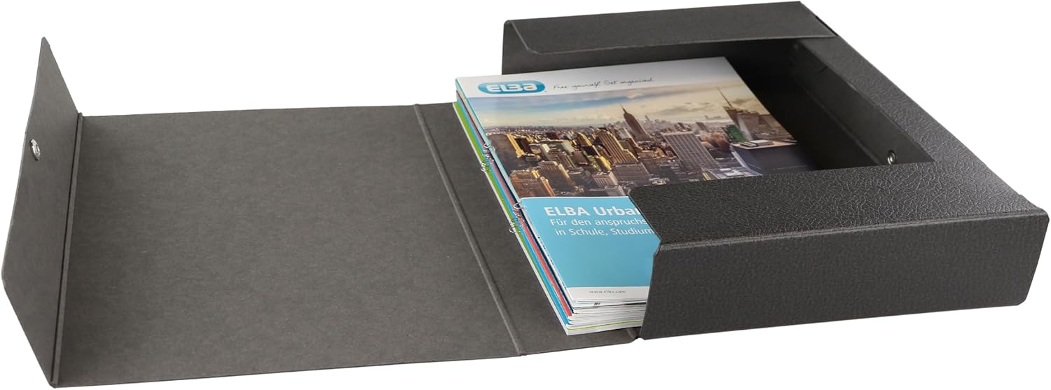 Elba document folders for storing and archiving documents. Safety thanks to the locking option. Features: for storing and collecting documents, magazines, etc. With three flap flaps and labelling labels, press stud closure made of 1.4 mm thick hard cardboard (recycled). Structured design, capacity: 85 mm. Colour: Black Certified with the Blue Angel Ecolabel