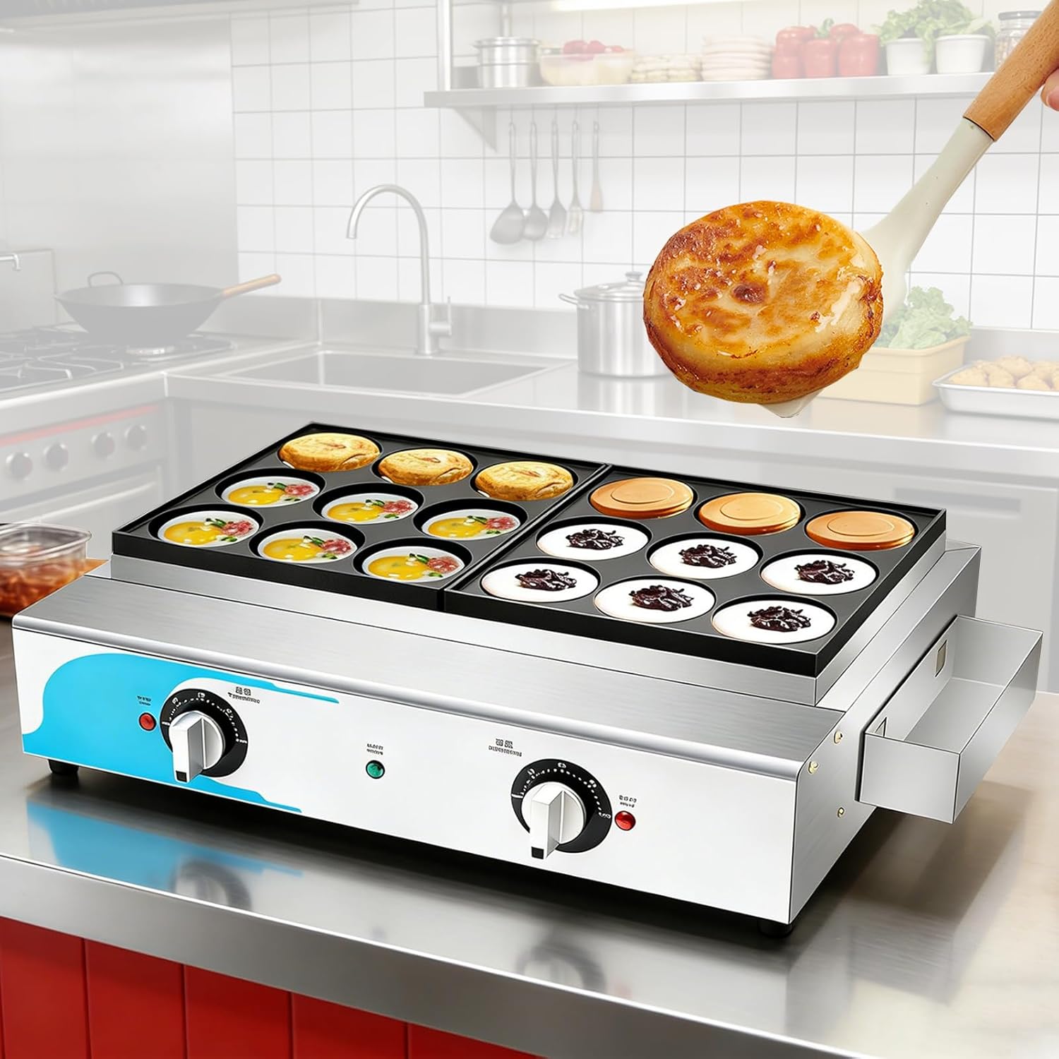This electric bacon and egg burger machine can prepare 9 / 18 egg burgers simultaneously. The heating temperature can be adjusted by turning the temperature control knob to suit your needs. Enjoy creating fluffy egg burgers filled with your favorite toppings using our burger maker.Features:Adjustable Temperature Control (50-300℃) with Power Indicator Light: Features a temperature control range with a clear power indicator light for monitoring operational status.Convenient Side Shelf for Utensils: The integrated side shelf offers handy space for tools such as sauce bottles.Bottom Ventilation for Thermal Management: Ventilation openings at the bottom aid in the machine's heat dissipation during and after use.Specification:Product Name: Electric Egg Burger MachineTemperature Control Range: 50-300℃Egg Burger Diameter: 8 cmPower: 2000 WMaterial: Galvanized Sheet + AluminumCable Length: 115 cmProduct Size: 313*372*135 mmWeight: Approx. 5 kgPacking List:Electric Egg Burger Machine * 1Note:Due to manual measurement, there may be a slight deviation of 1-10 mm. Please refer to the actual product.If you have any questions, please contact us via email. We are here to assist you.