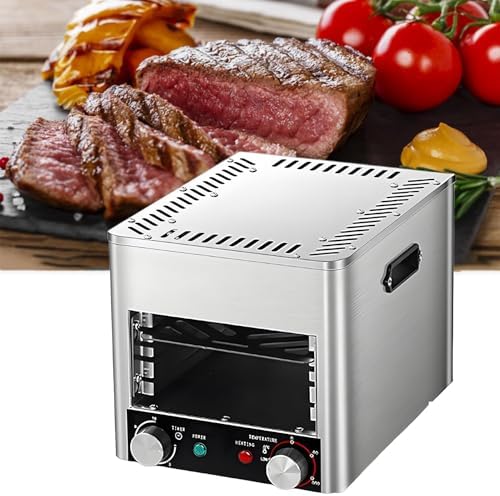 Transform your cooking experience with this electric steak grill, expertly engineered for rapid, even searing and versatile cooking. Enjoy restaurant-quality steaks right in the comfort of your home. Featuring a robust 1700W/3400W ceramic PTC heating system, it can reach an impressive temperature of 800°C (1472°F) within minutes, sealing in flavor and moisture for perfectly crispy steaks. The intuitive stepless knob allows precise control over both temperature (200-800°C) and cooking time (0-10 minutes), complete with a built-in indicator light for easy use. This grill offers 4 or 8 adjustable grill slots and allows you to modify the cooking height to accommodate various food types, from thick rib-eye and T-bone steaks to chicken, seafood, and even desserts. The electric design promotes safer, cleaner indoor cooking without the hassle of gas. The non-stick grill components are removable and washable, ensuring easy cleanup. Specifications include: Power options of 1700W / 3400W, heating method of Ceramic PTC, temperature range of 200–800°C (392–1472°F), and timing range of 0–10 minutes. Made from high-quality stainless steel and PP, this grill features an adjustable frame design with 4 or 8 layers, and operates on a voltage of 110-120V.