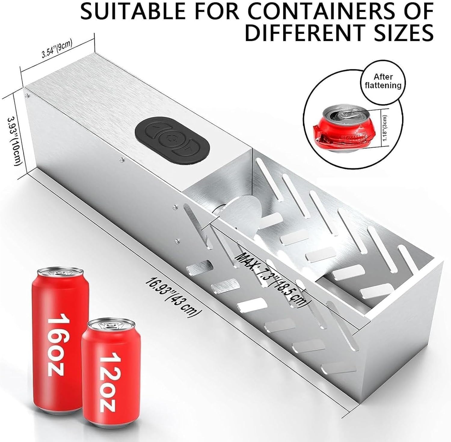 Make recycling effortless and efficient with this Electric Can Crusher. Designed to crush aluminum cans and plastic bottles to about 20% of their original size, this wall-mounted machine helps you save space and promotes waste management. Operating on household power without the need for bulky air compressors, it features one-button control and an automatic cycle function, allowing you to load the cans and let the machine do the work. The crusher can handle cans and bottles ranging from 200-500ml, including most standard-sized aluminum cans and plastic water bottles. Whether installed on the wall or kitchen cabinet, it takes up minimal space and provides a convenient, safe, and effective solution for recycling. With its stainless steel construction, this can crusher is built to last and ensures smooth, steady operation.