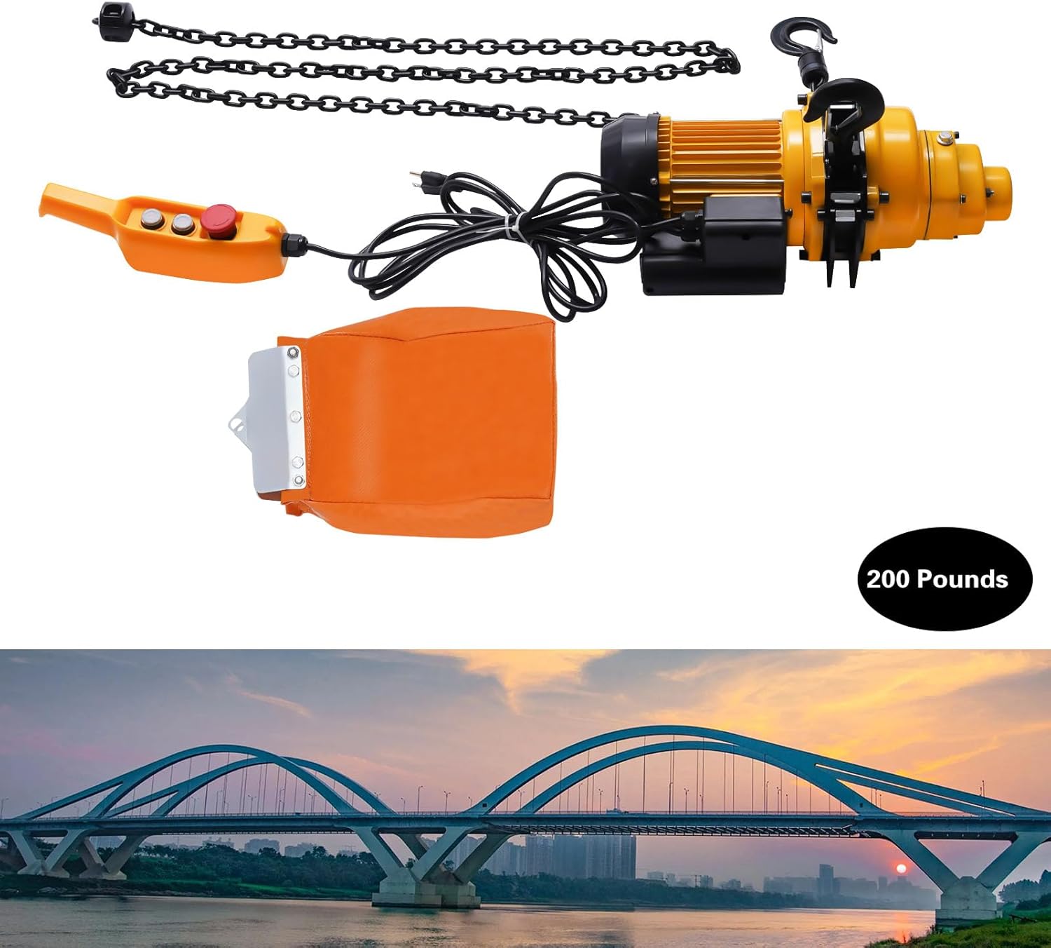 Color: Orange ColorHousing Material: Aluminum AlloyChain Material: 20Mn2Hook Material: Manganese SteelRated Voltage: 110VRated Power: 1500WStyle: ModernType: Double ChainsMotor Protection Grade: IP55Insulation Class: FChain Diameter: 6.3mm/0.25inchMotor Type: Pure Copper MotorPlug Type: American Standard Maximum Load Capacity: 1T/2200lbsLifting Speed: 4m/min (13ft/min) Lifting Height: 4m/13ftHandle Switch Wire Length: 3m/10ftGross Weight: 28kg/61lbsPackage Size: 51x28.5x39cm/20.9x11.22x15.35inchMachine Body Size (LxH): 45x15cm/17.72x5.91inchPackage Included1x Electric Chain Hoist1x Lifting Strap1x Chain Bag1x English Manual1x English Inspection Certificate1x Chinese&English Warning