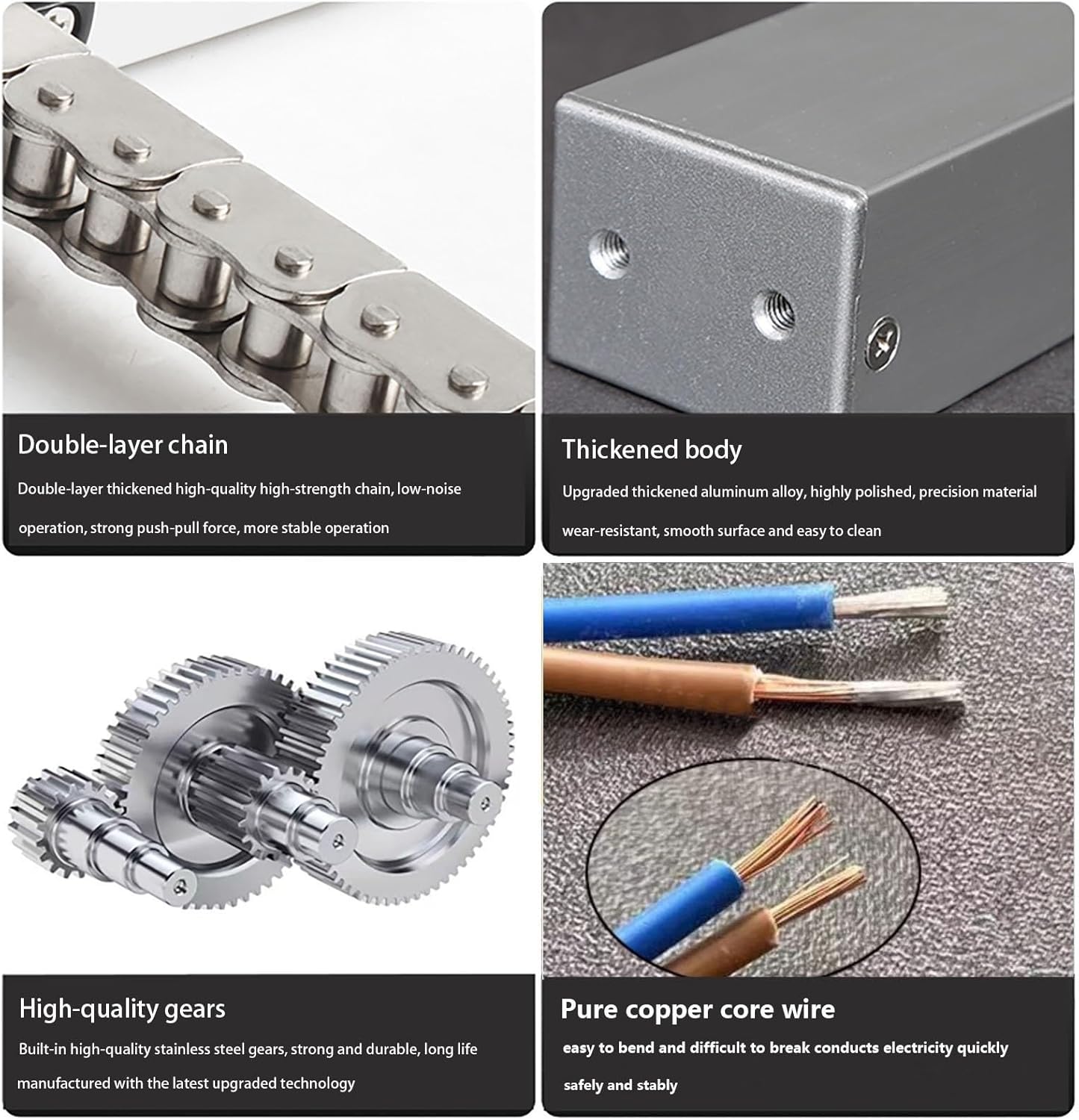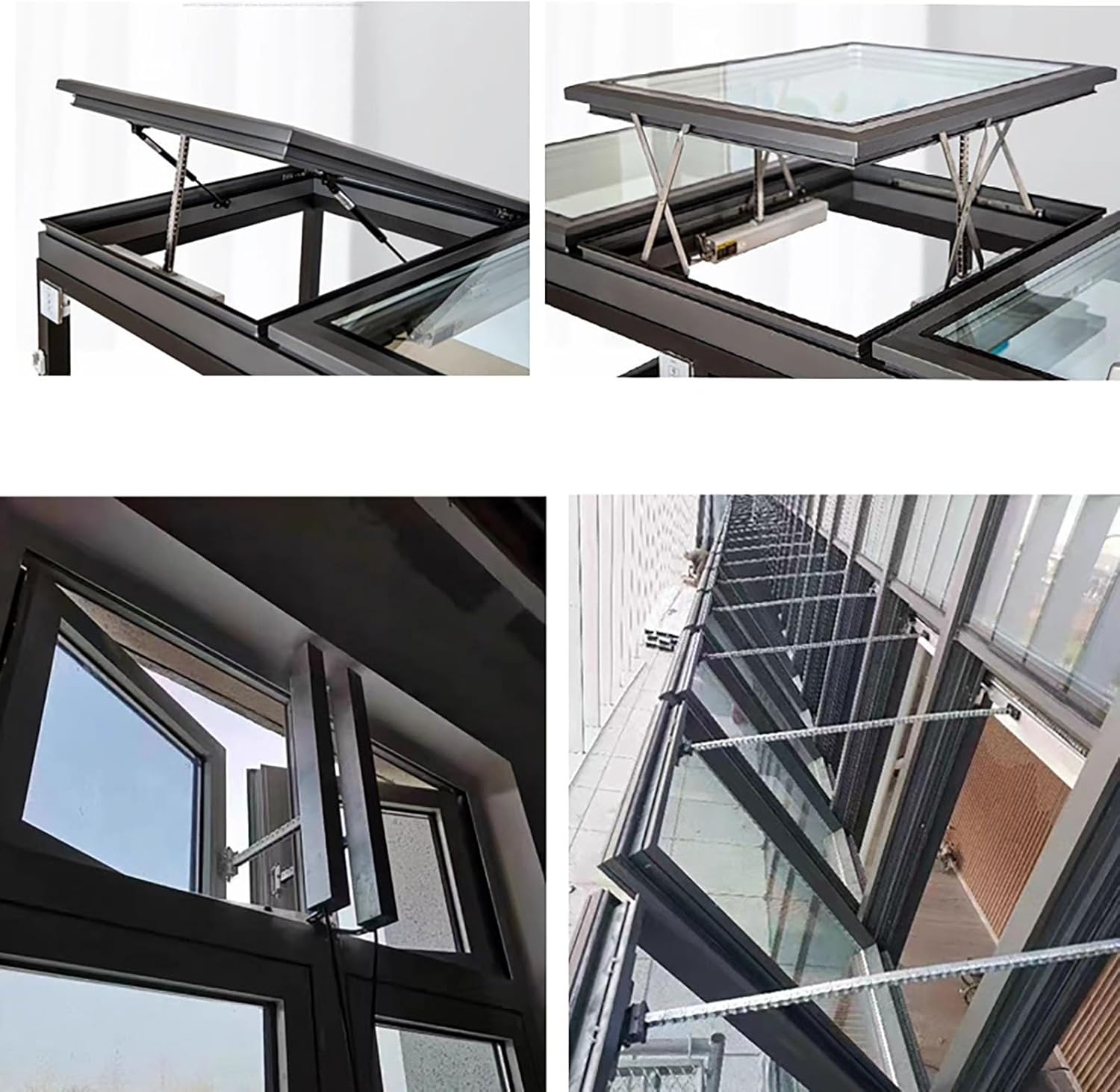 Electric Chain Window Opener Actuator, Window Opener Aid, 24V Stroke 300-800 MM Smart Window Opener Driver Motor with Switch Controller for Skylights Roof Vent Features: 1. Overload protection, low noise design 2. Double-layer metal chain design, more stable and smooth operation 3. Wireless remote control and rain sensor, more flexible and convenient to use 4. Generous and exquisite appearance design 5. Suitable for skylights, hanging windows, high-altitude window sashes and natural ventilation and smoke and heat exhaust windows in various fire-fighting places Product name: chain window opener Product material: metal Rated voltage: DC24V Torque: 600N Input voltage: 100V~240VAC Product stroke: 300/400/500/600/700/800/1000MM Applicable scenarios: skylights, greenhouse windows, double-hung windows, sliding windows, roof windows, casement windows or ventilation windows Product list: 1*24V window opening motor Accessories Remote control Rated voltage (appliances or chargers): AC110-240/50HZ;