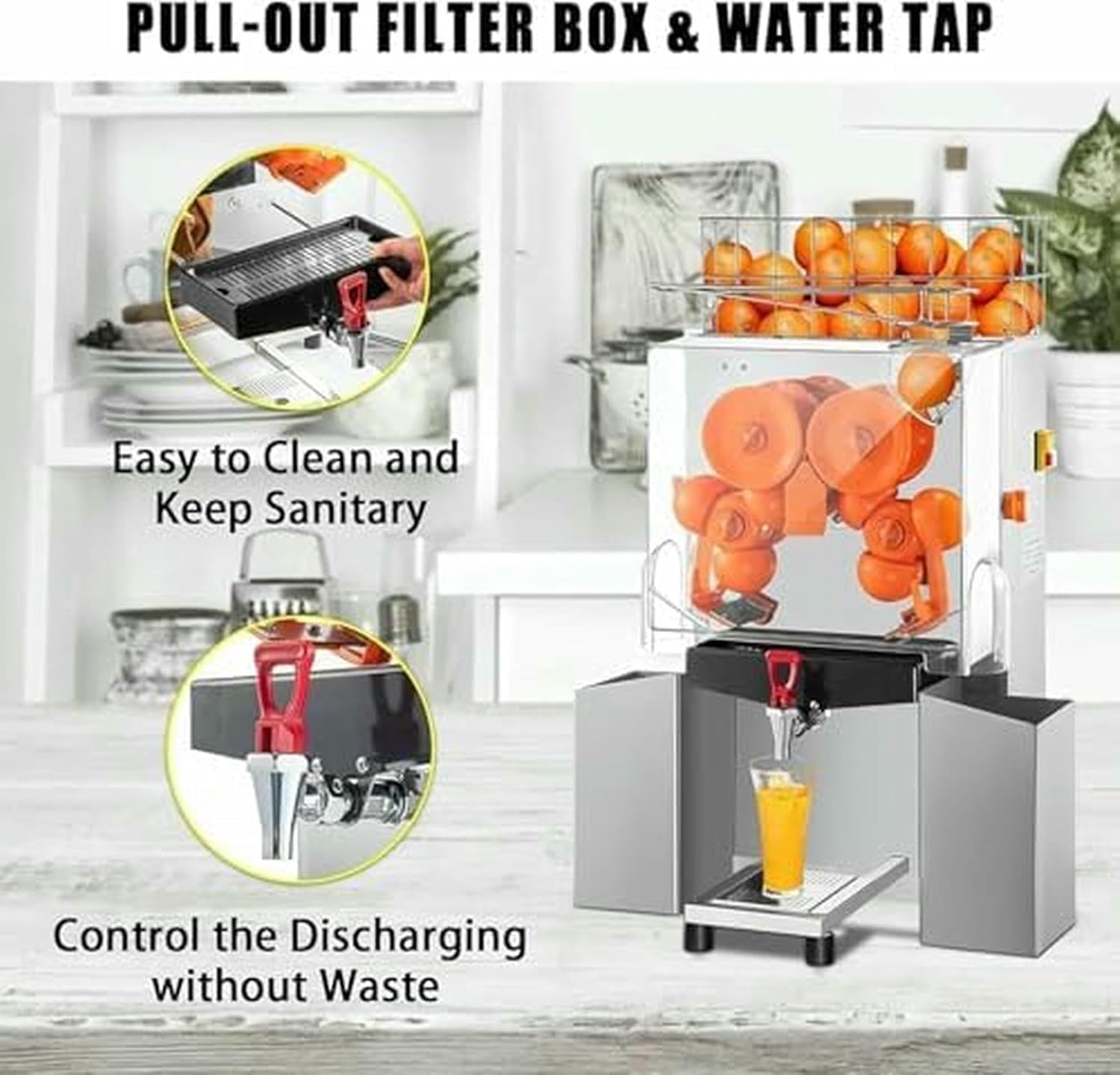 Introducing our high-performance orange squeezer, designed for those who value quality and efficiency. Made with durable stainless steel housing and completely metallic gears, it guarantees longevity and reliability. With a safety off switch for your peace of mind, you can squeeze 20 to 30 oranges per minute, which translates to 4 to 7 glasses of fresh juice in just minutes. The squeezer requires the lid to function, ensuring safety during operation. It is versatile enough to handle various fruits, including grenades, lemons, and oranges. Effortlessly clean and utilize this machine for your juicing needs.Specifications:- Material: stainless steel + acrylic- Power: 120 W- Production capacity: 25-35 oranges per minute- Compatible orange size: φ1.6 "-3.1"/φ40-80 mm- Product weight: 96.8 lbs/43.9 kg- Product dimensions: 45 x 34 x 78.5 cm (17.7 x 13.4 x 30.9 inches)- Package includes: 1 orange squeezer